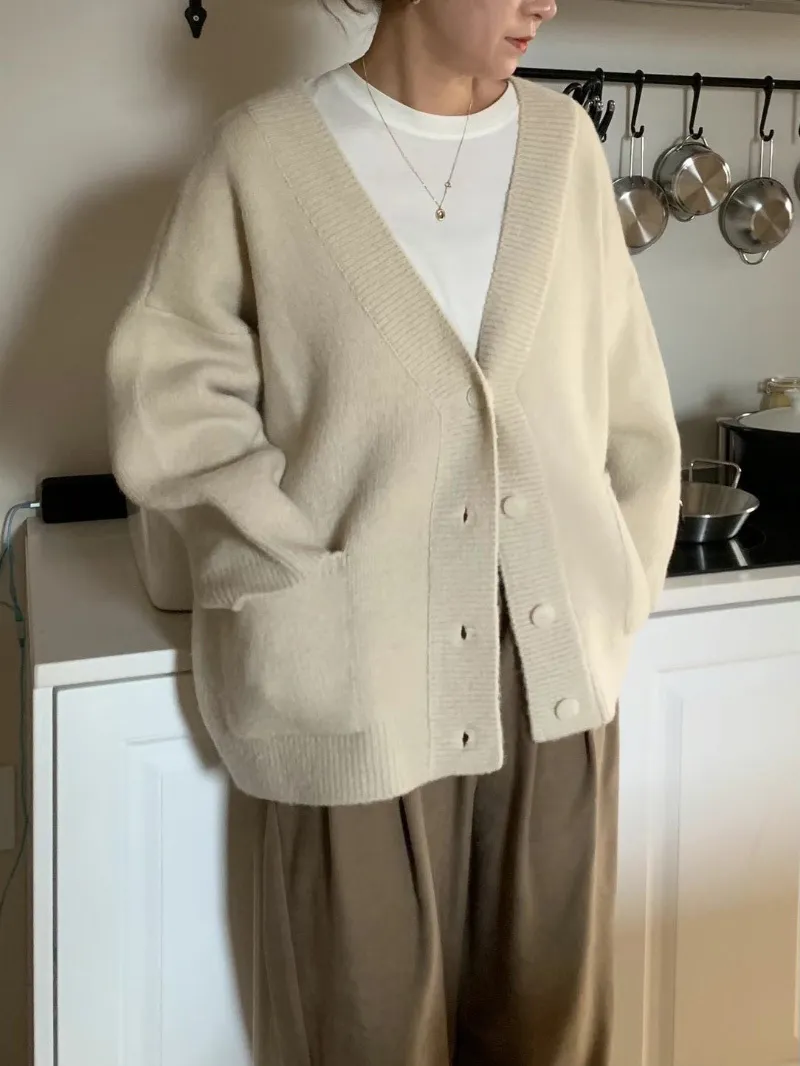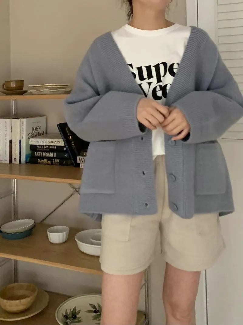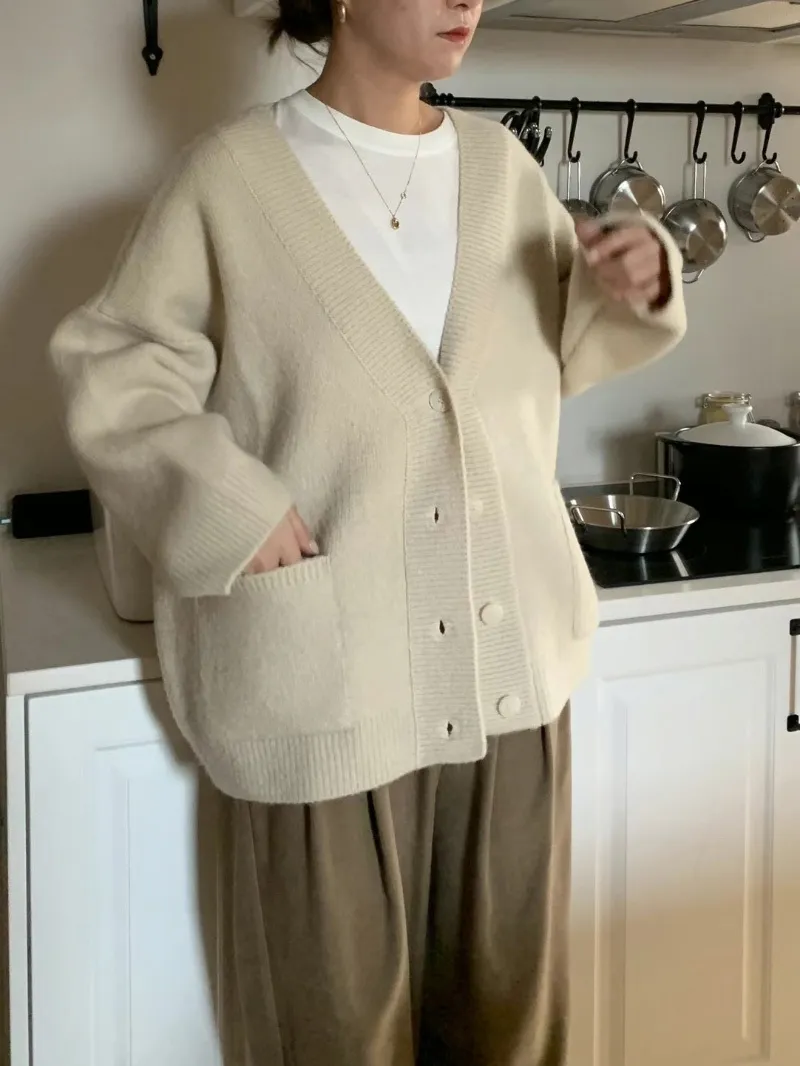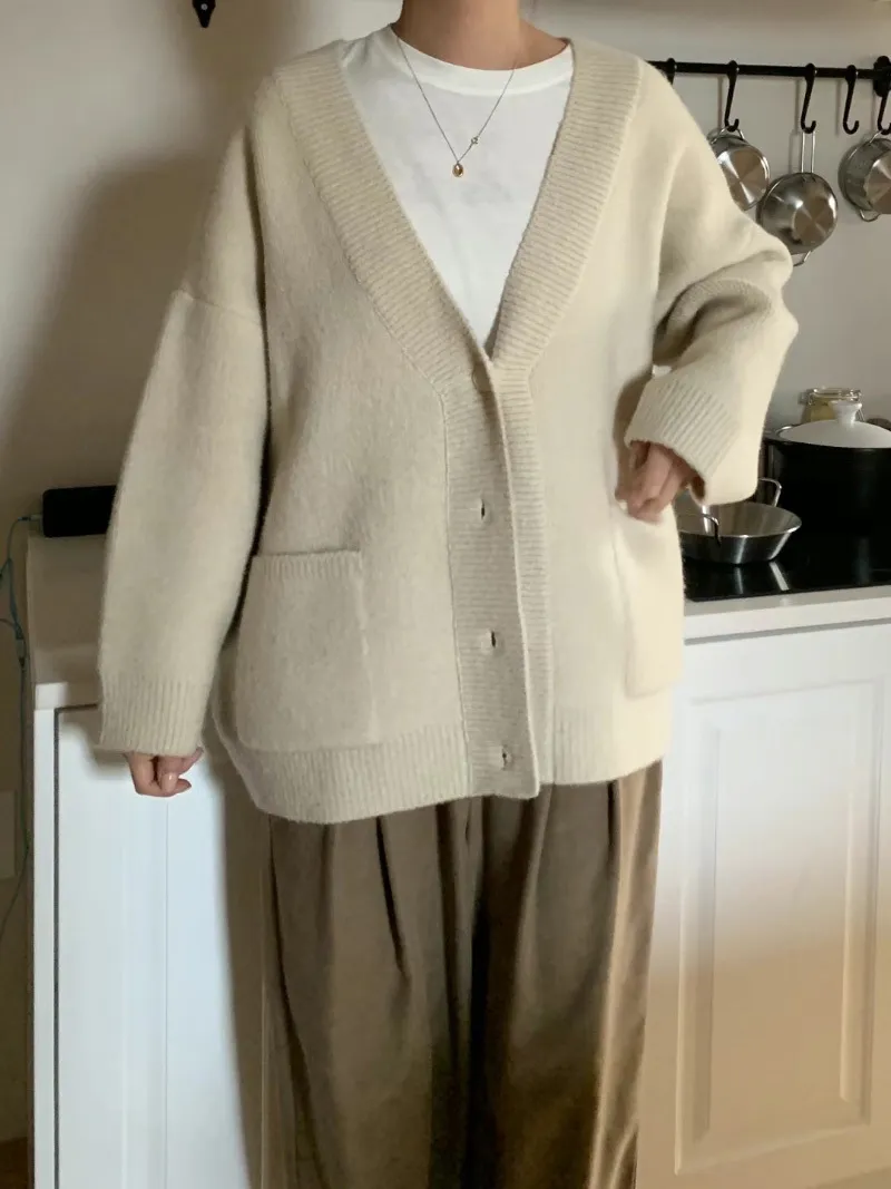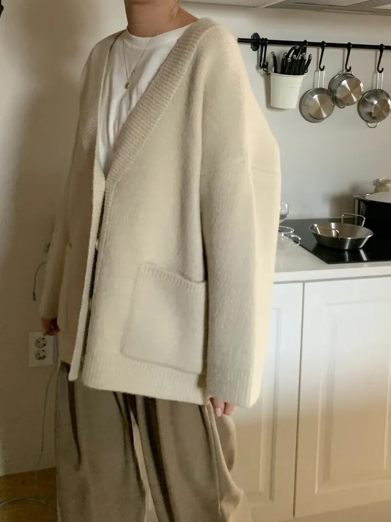 D54店長真愛*慵懶休閒雙口袋設計大V領羊毛針織外套