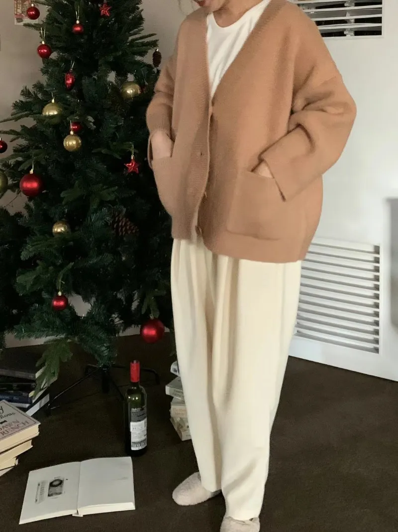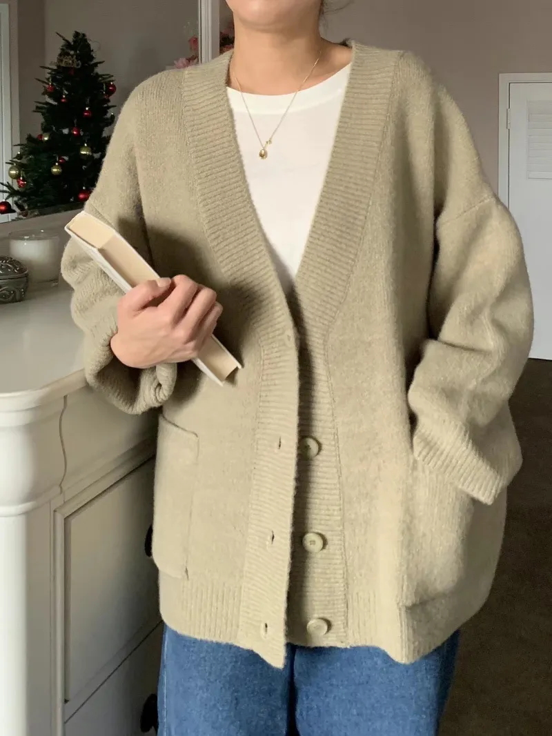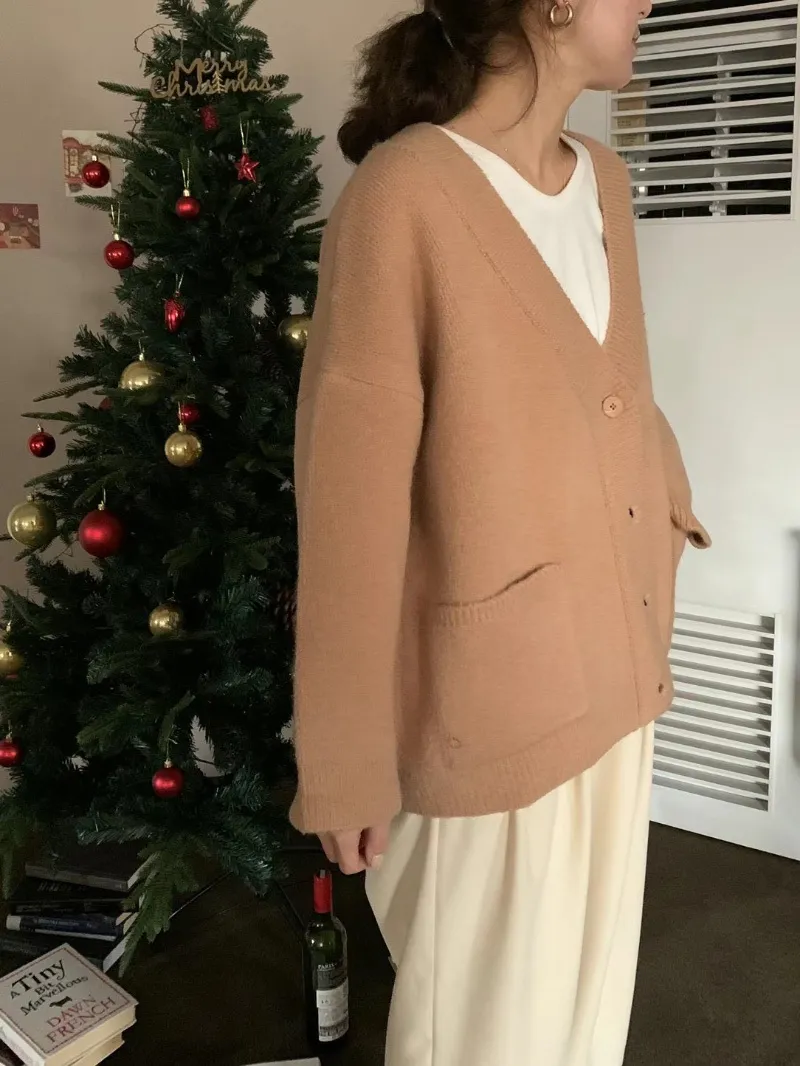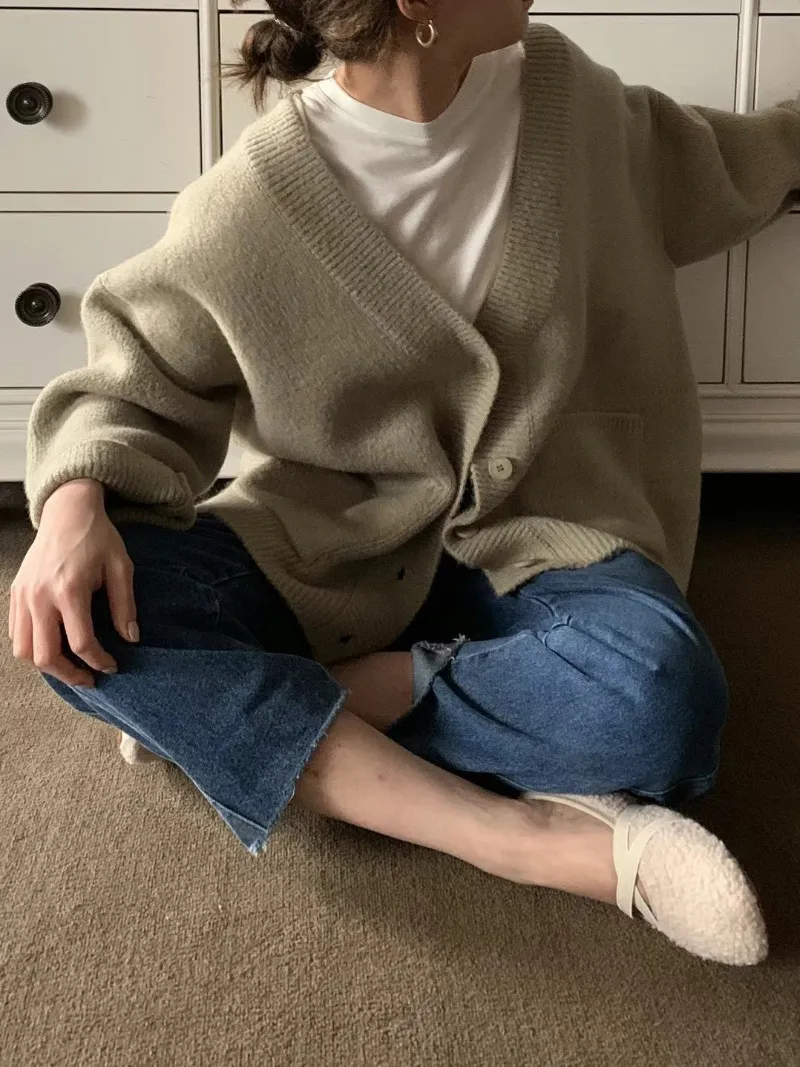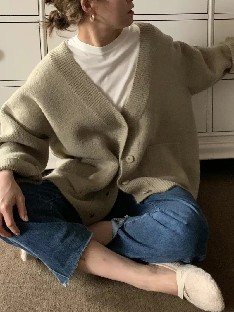 D54店長真愛*慵懶休閒雙口袋設計大V領羊毛針織外套