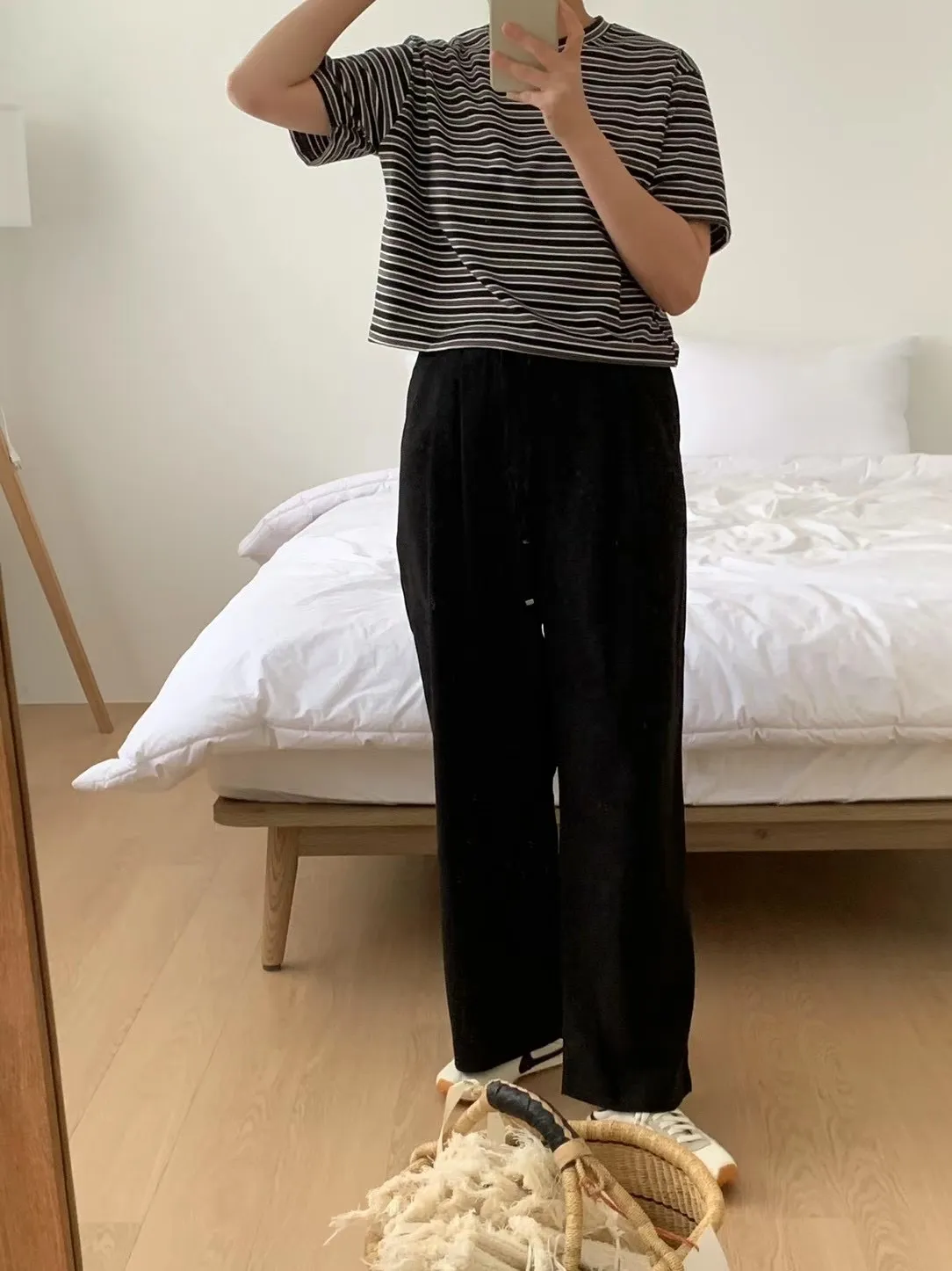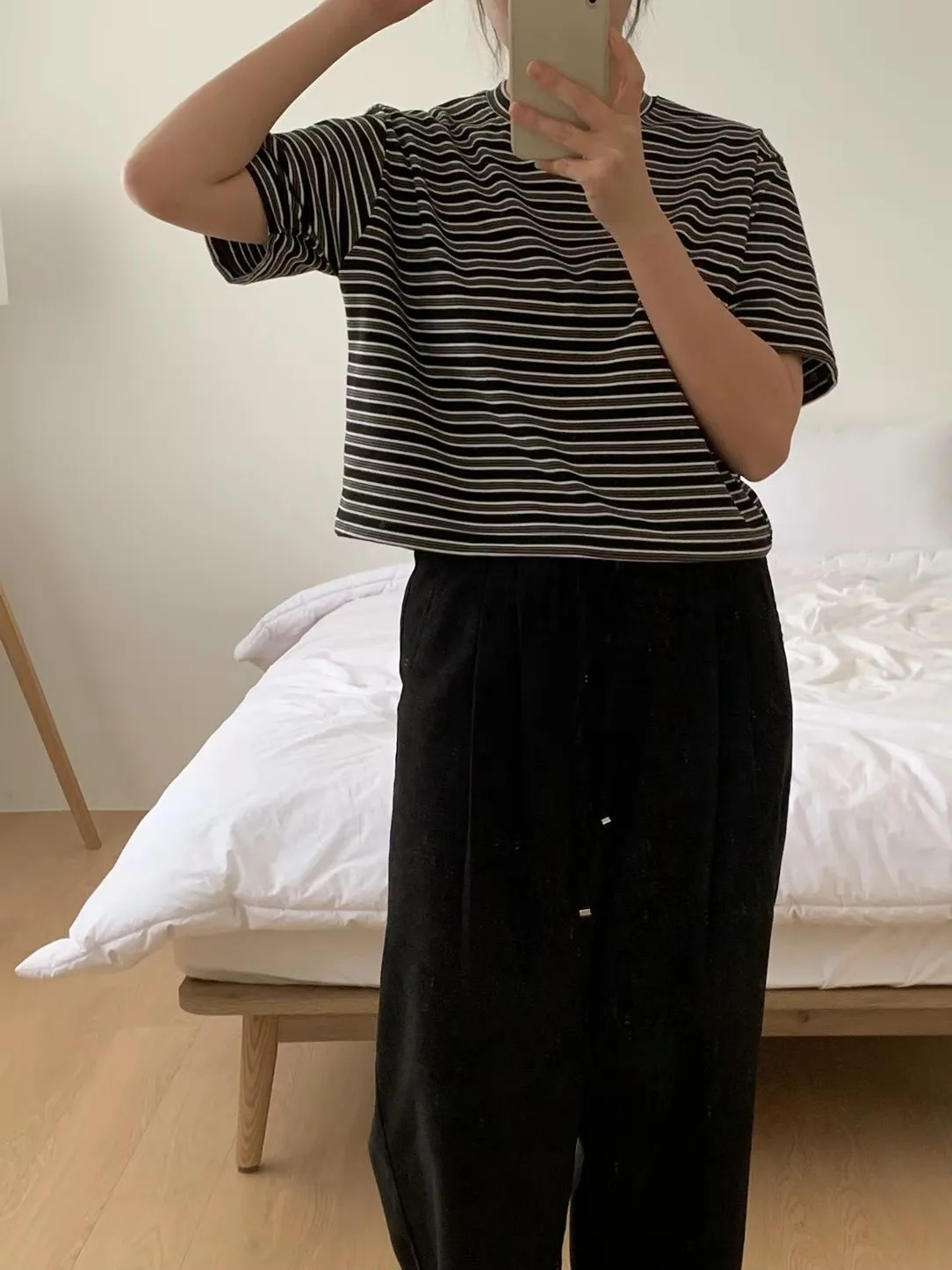 N11 miu系穿搭必收!厚款絨毛細條紋配色短T