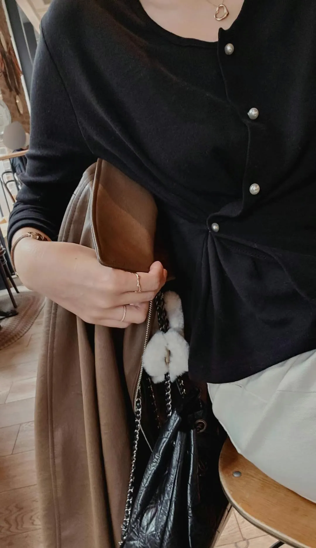 材質:67%天絲+29%羊毛+4%彈力立體的珍珠美釦 日常的低調小華麗簡單就美😘😍 高比例天絲羊毛材質,舒適親膚不刺癢~大V領的肩頸線條很修飾, 左側有一顆珍珠釦,可以穿成斜扣的不對稱穿法。歐尼建議可以依自己身型調整側邊珍珠釦的高度,讓不對稱線條更美更順 修身版型,建議XS~小L穿著