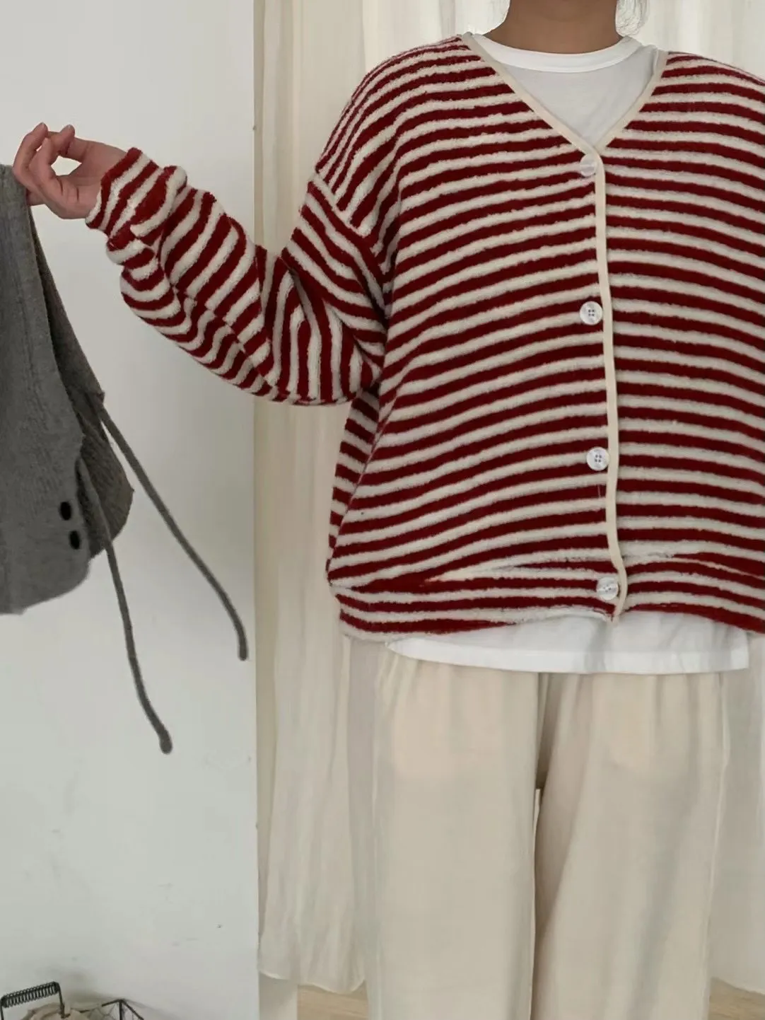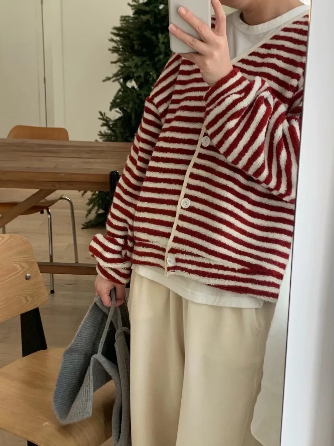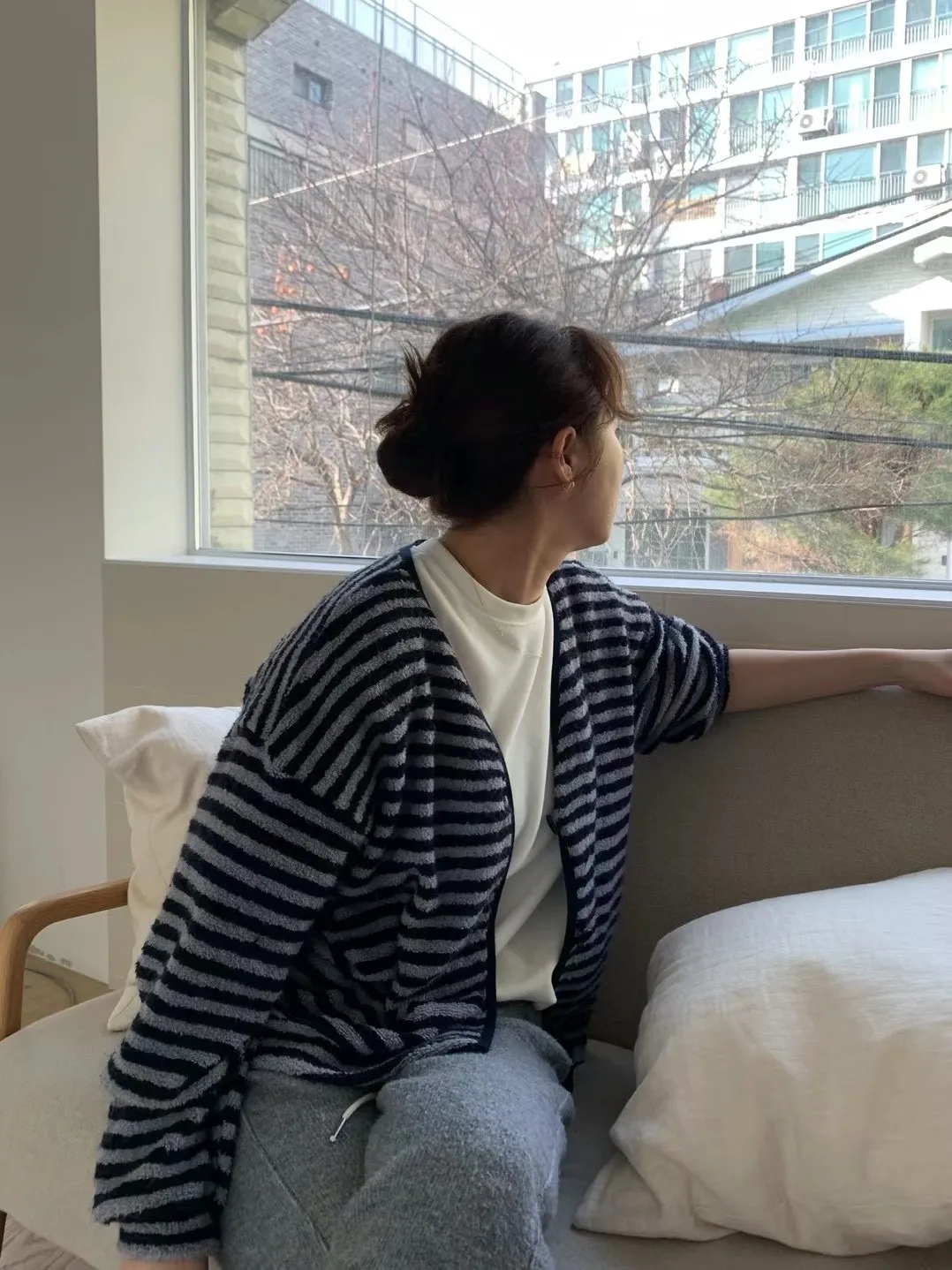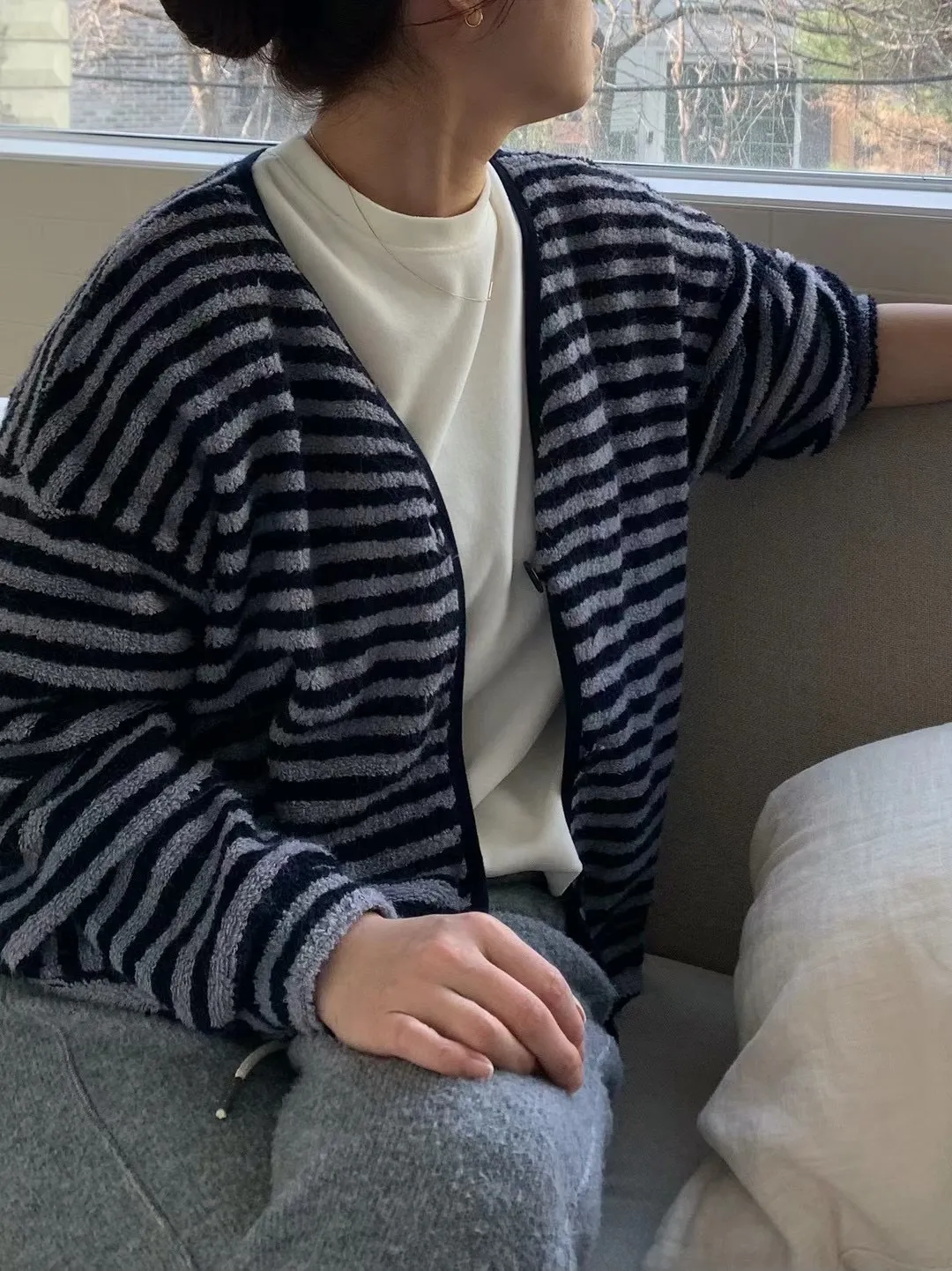 D11溫暖冬季軟綿綿條紋開襟罩衫外套