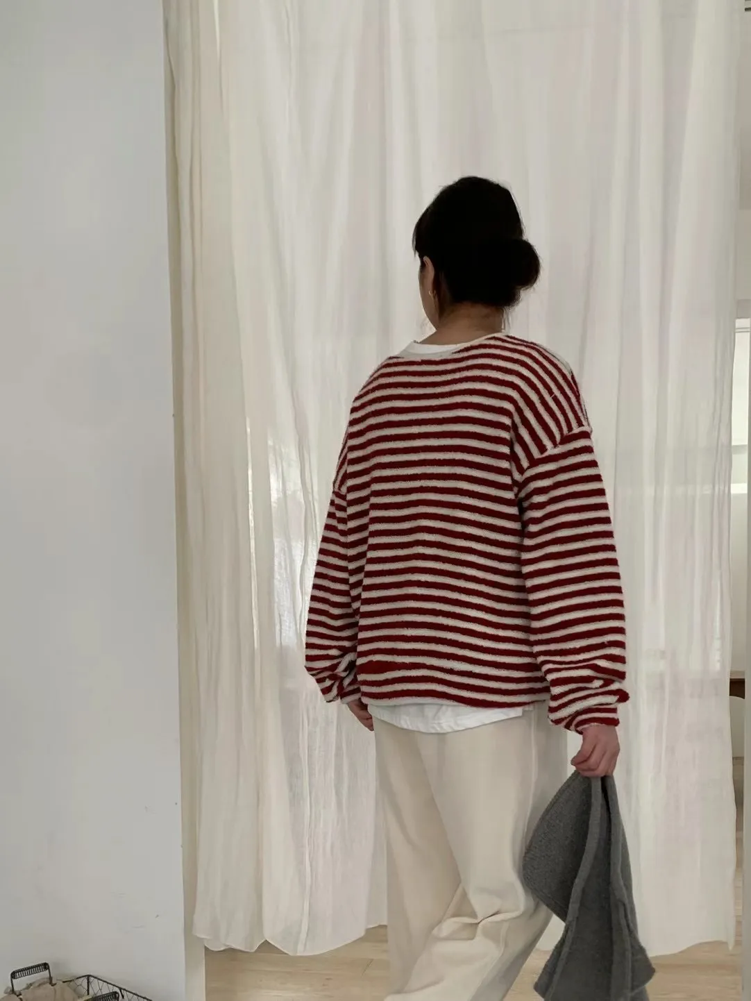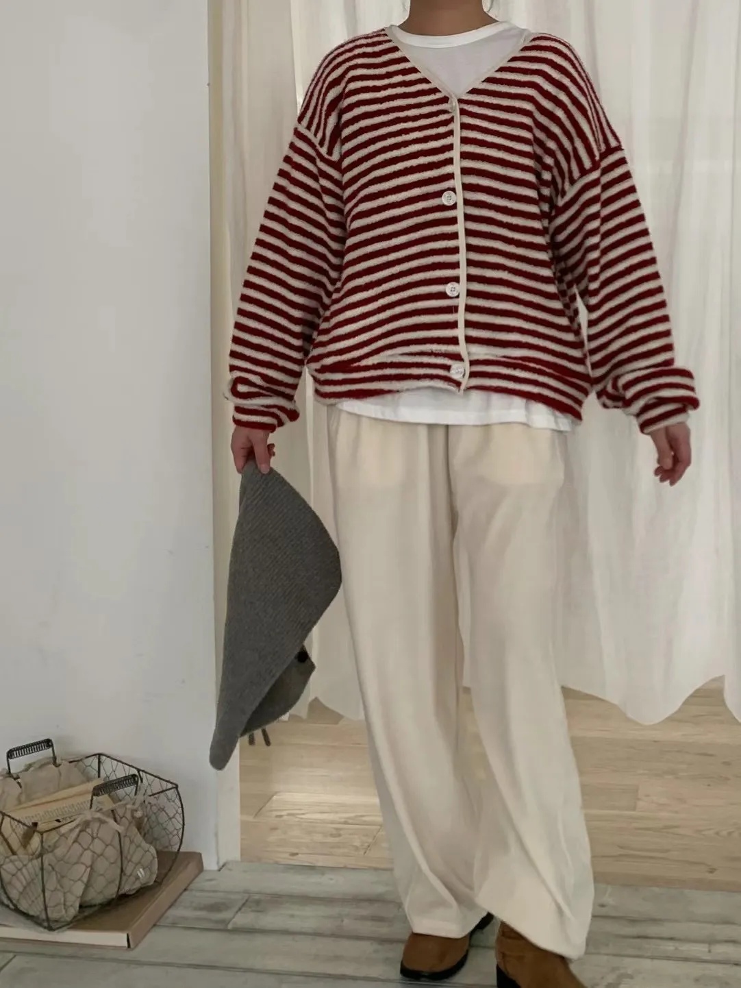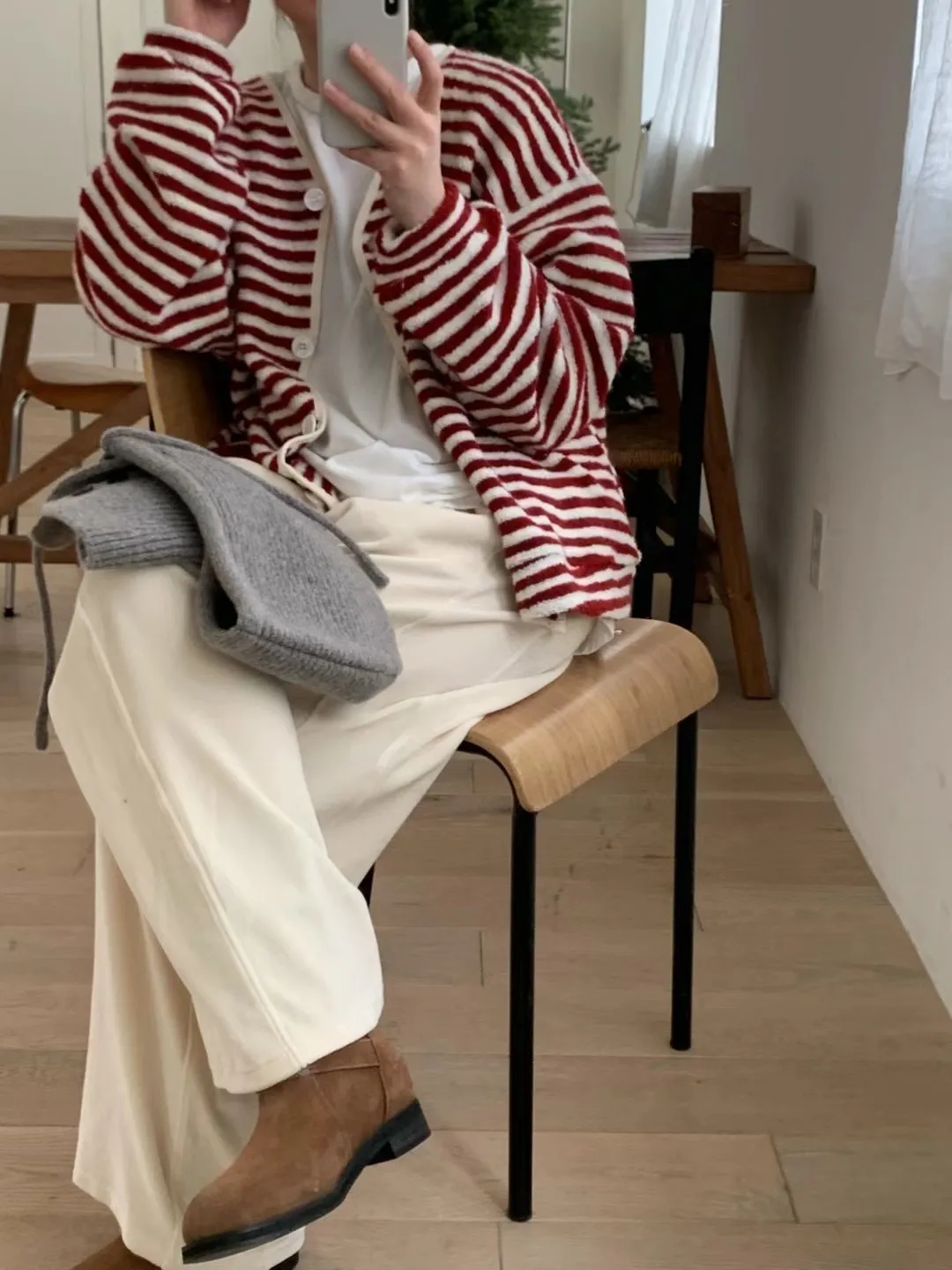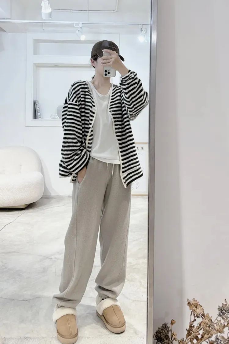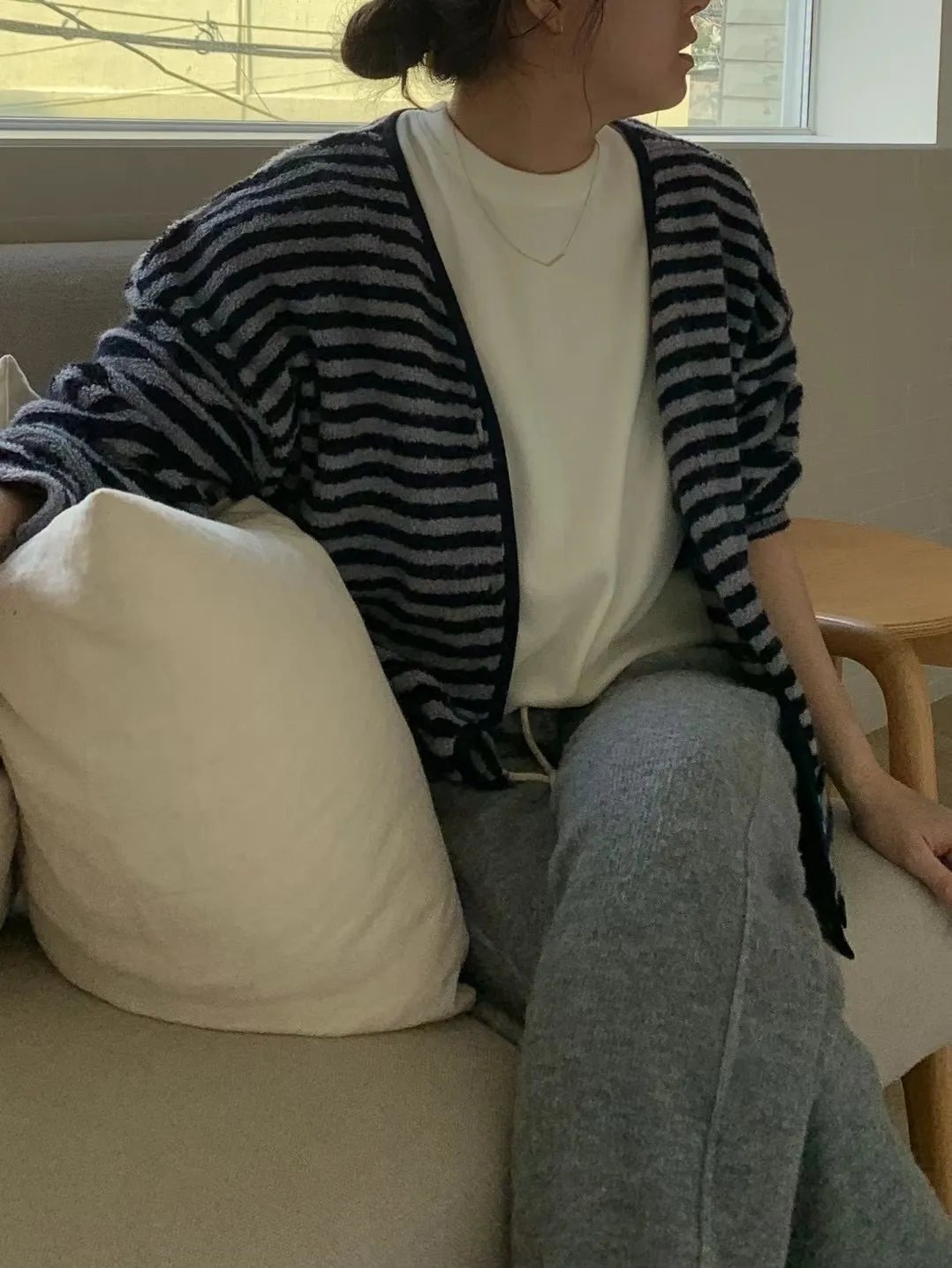 D11溫暖冬季軟綿綿條紋開襟罩衫外套