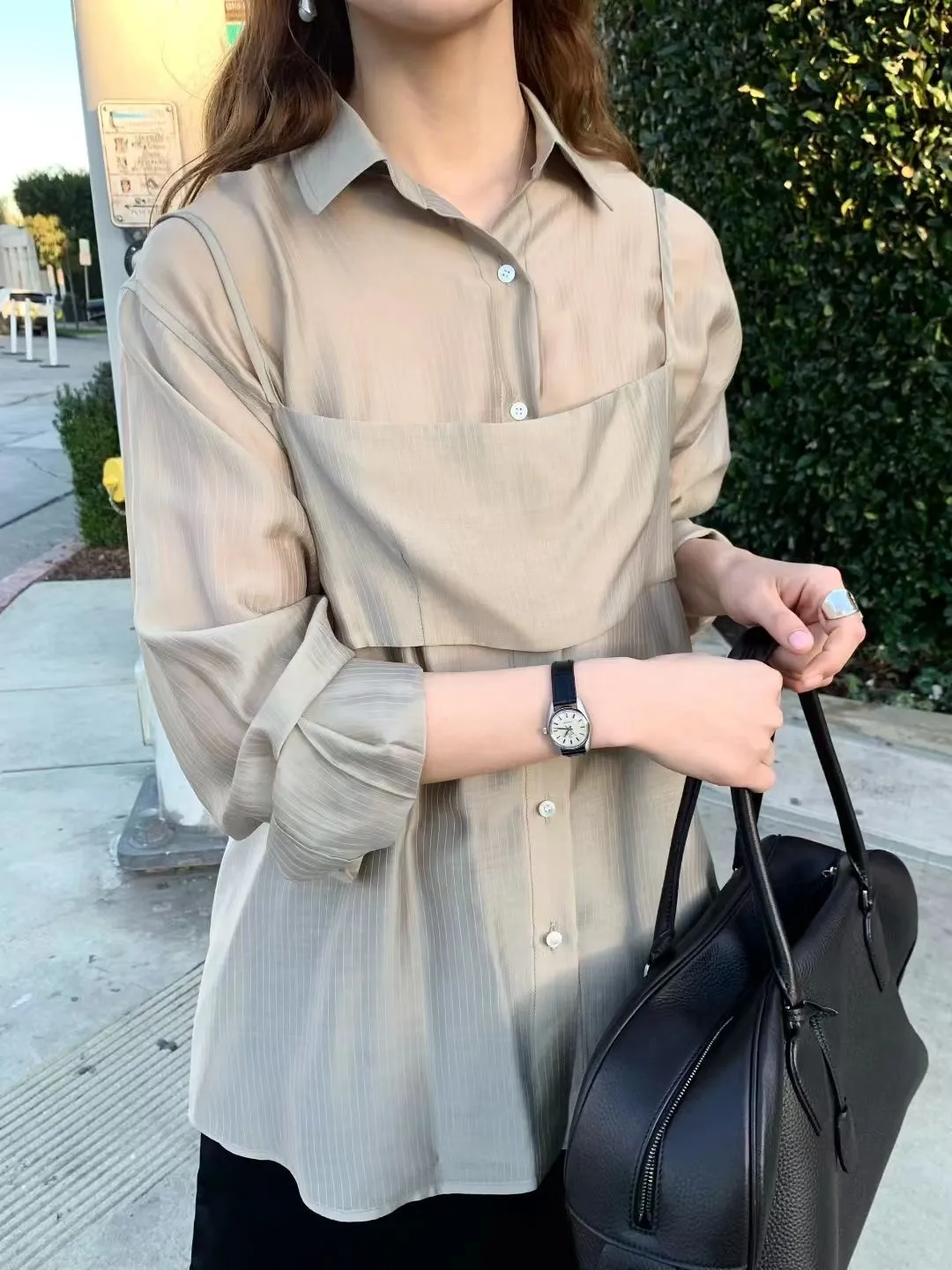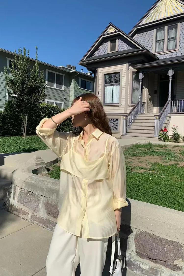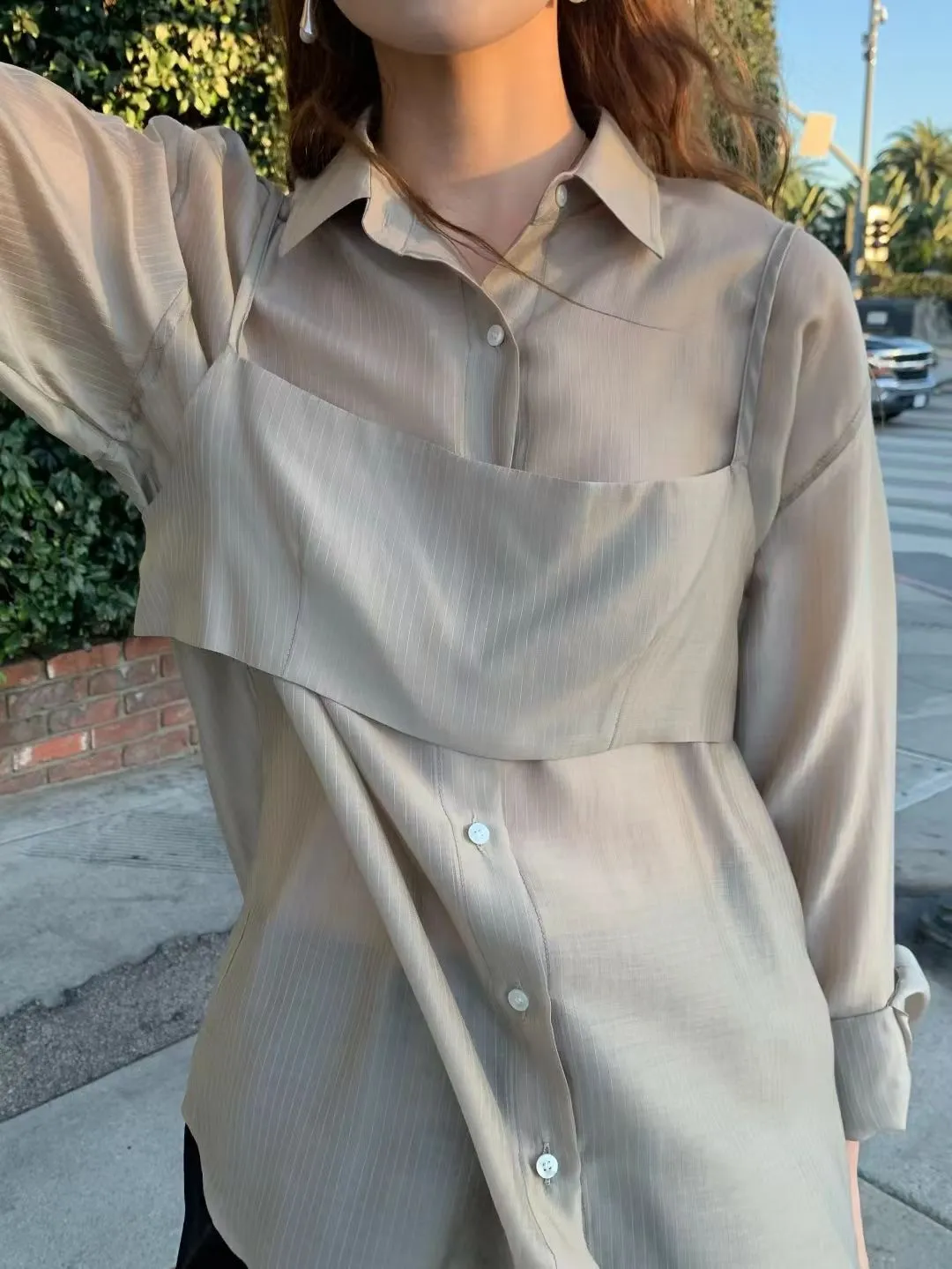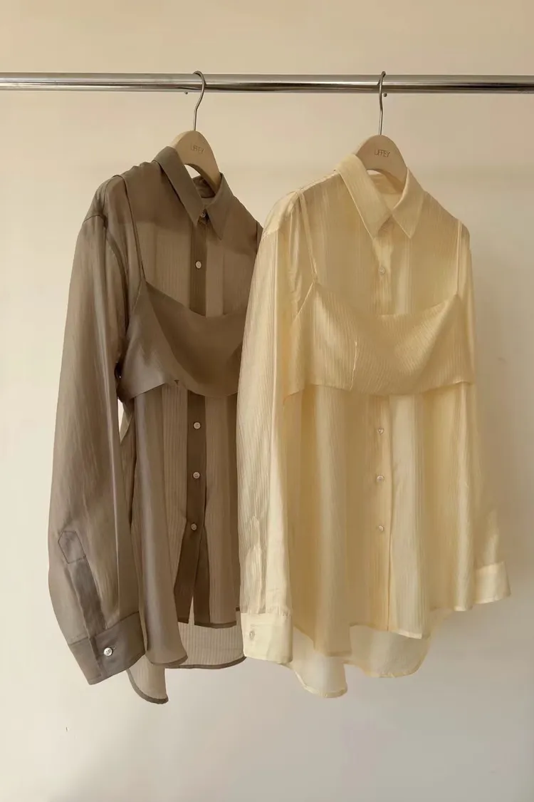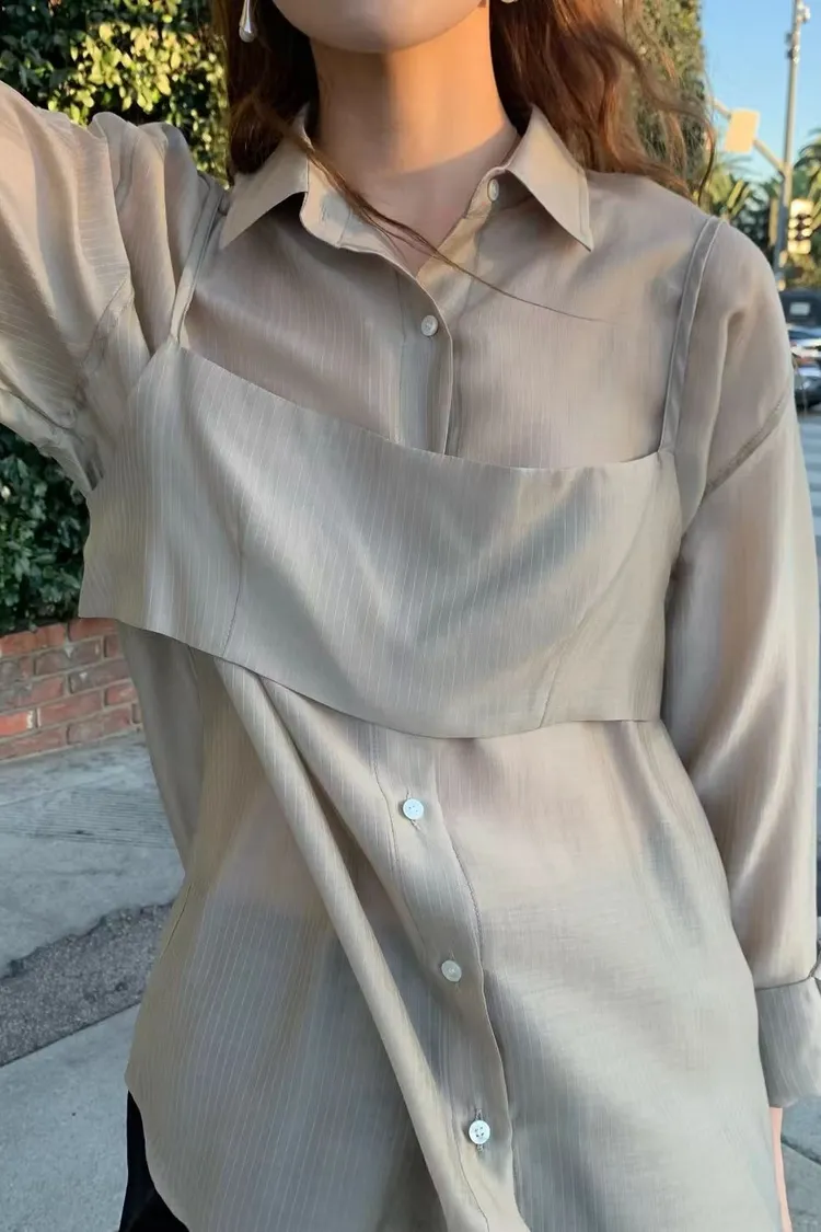 M02店長真愛❤超美光澤感細條紋襯衫+細肩帶套裝