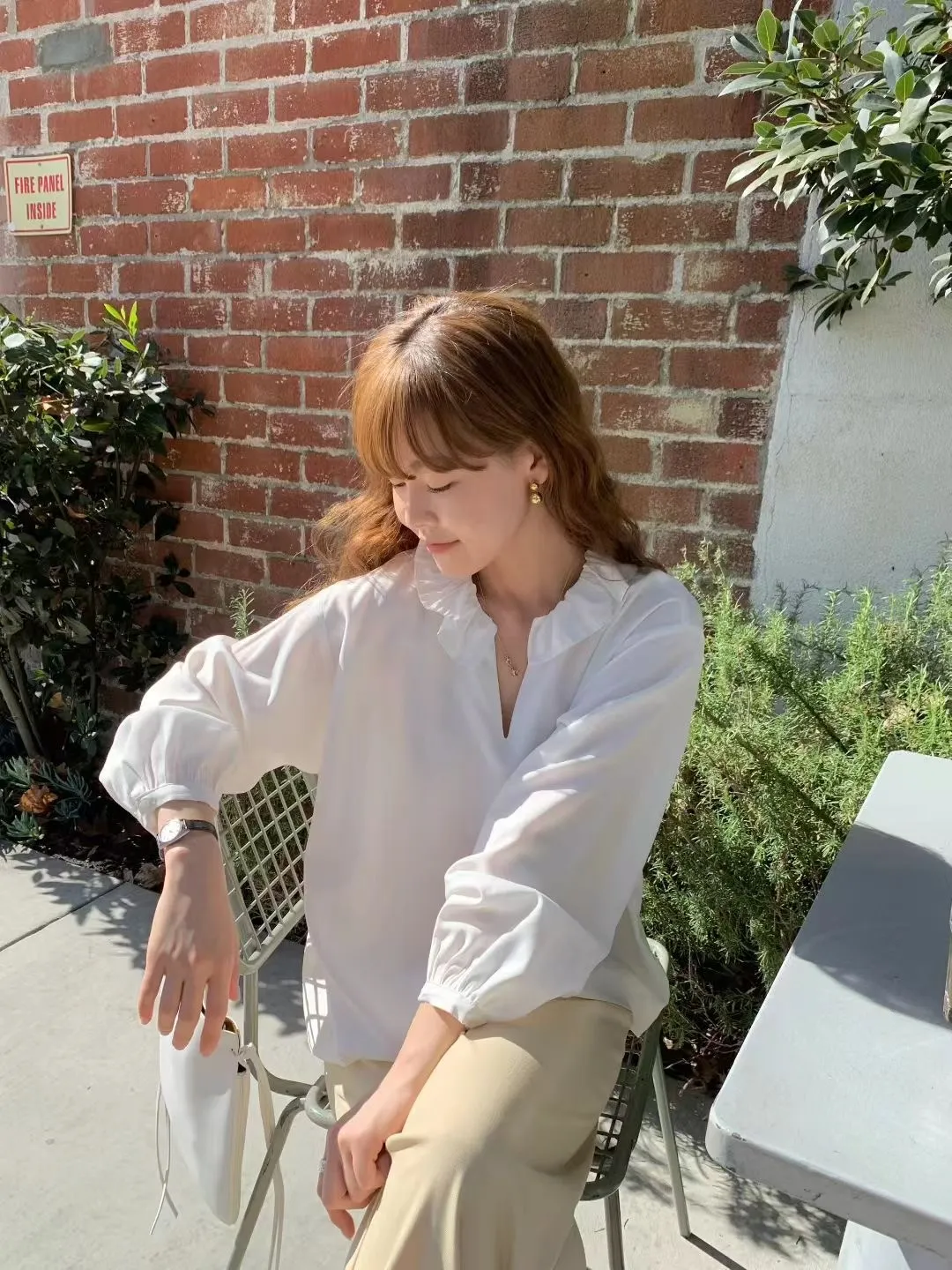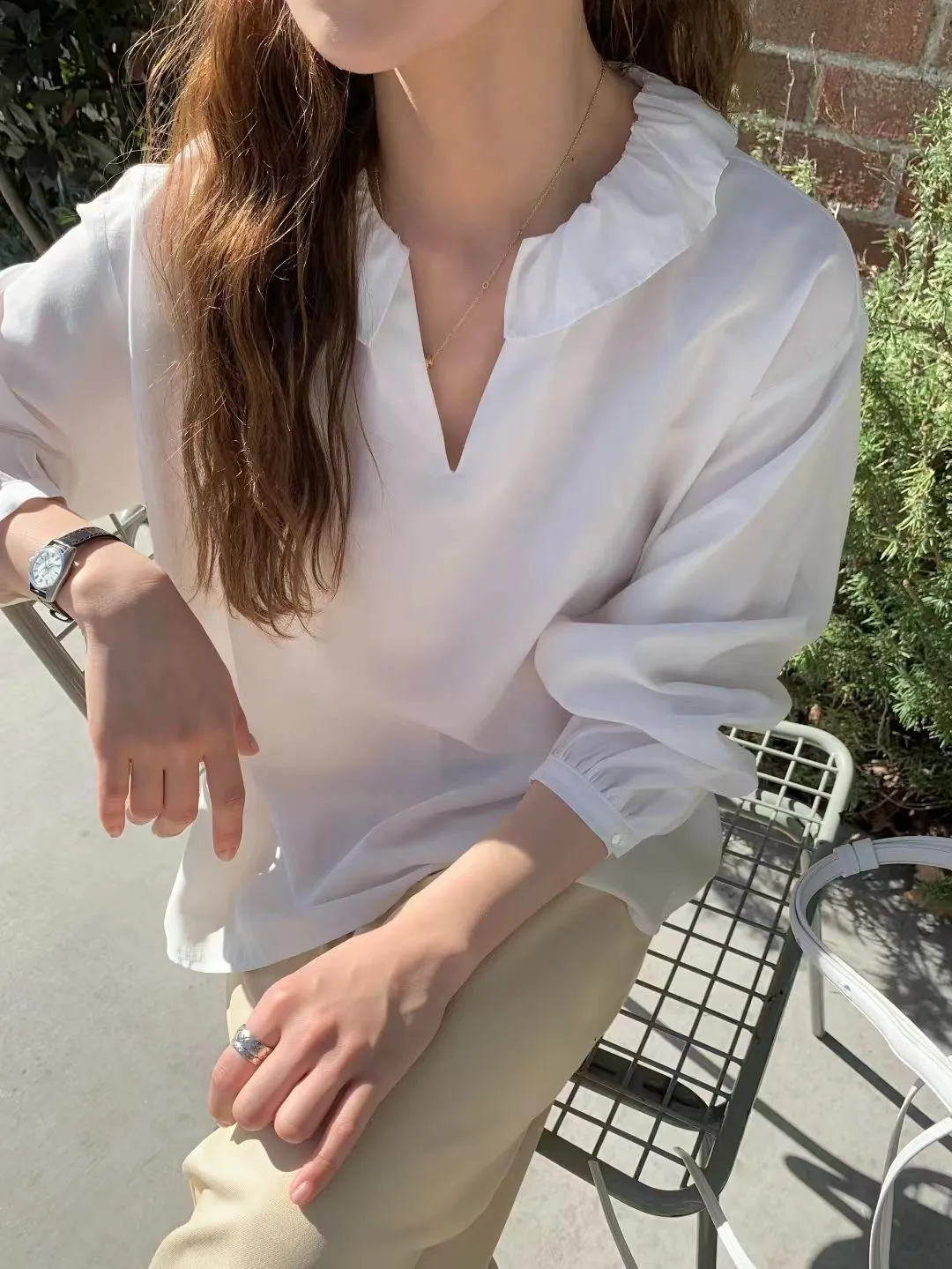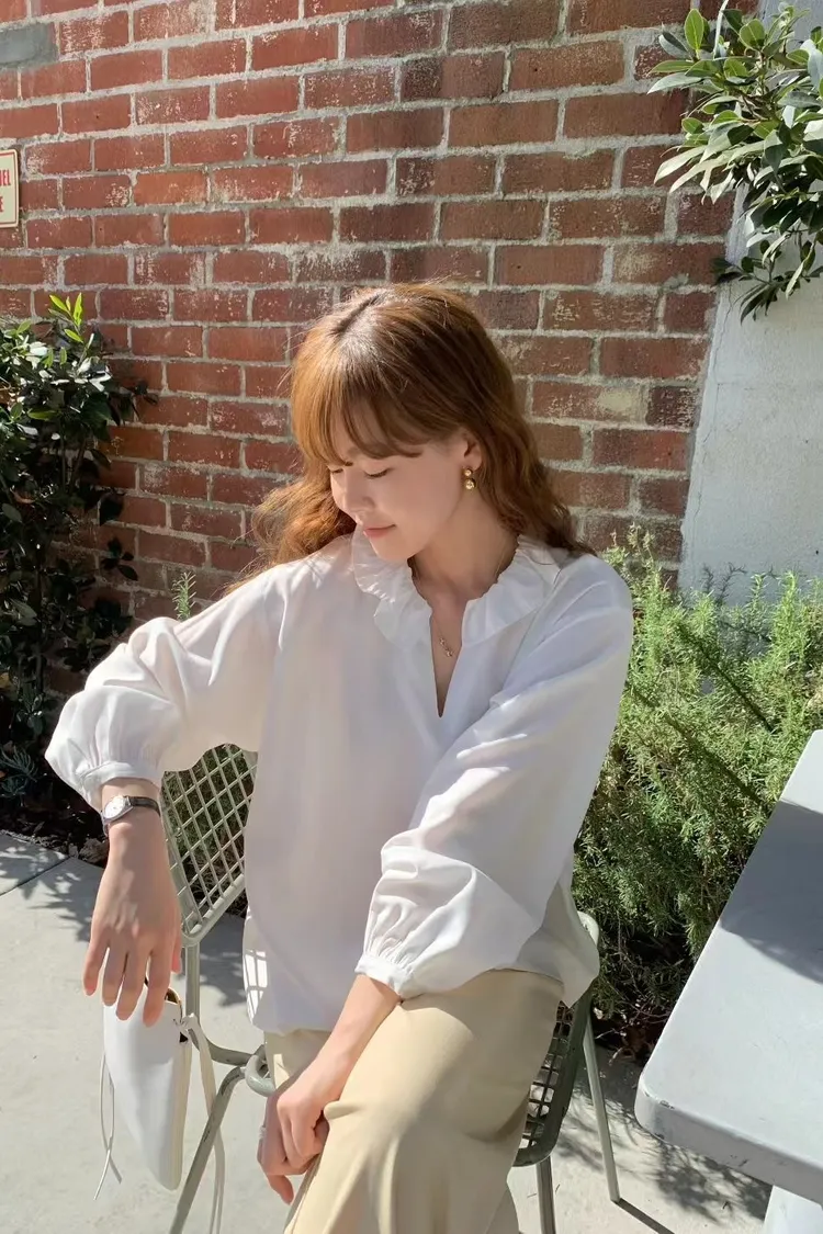 M07浪漫小女人感領口荷葉滾邊v領開襟罩衫