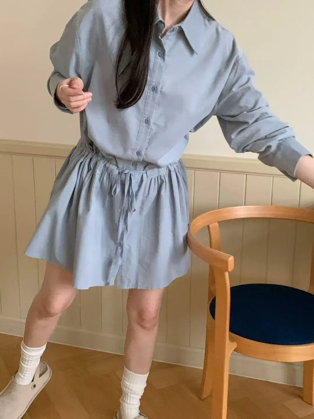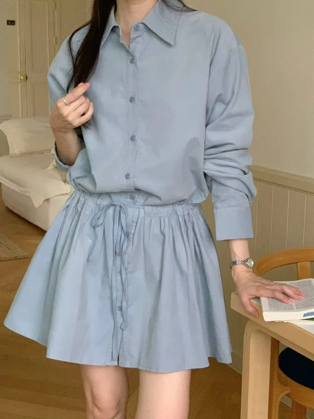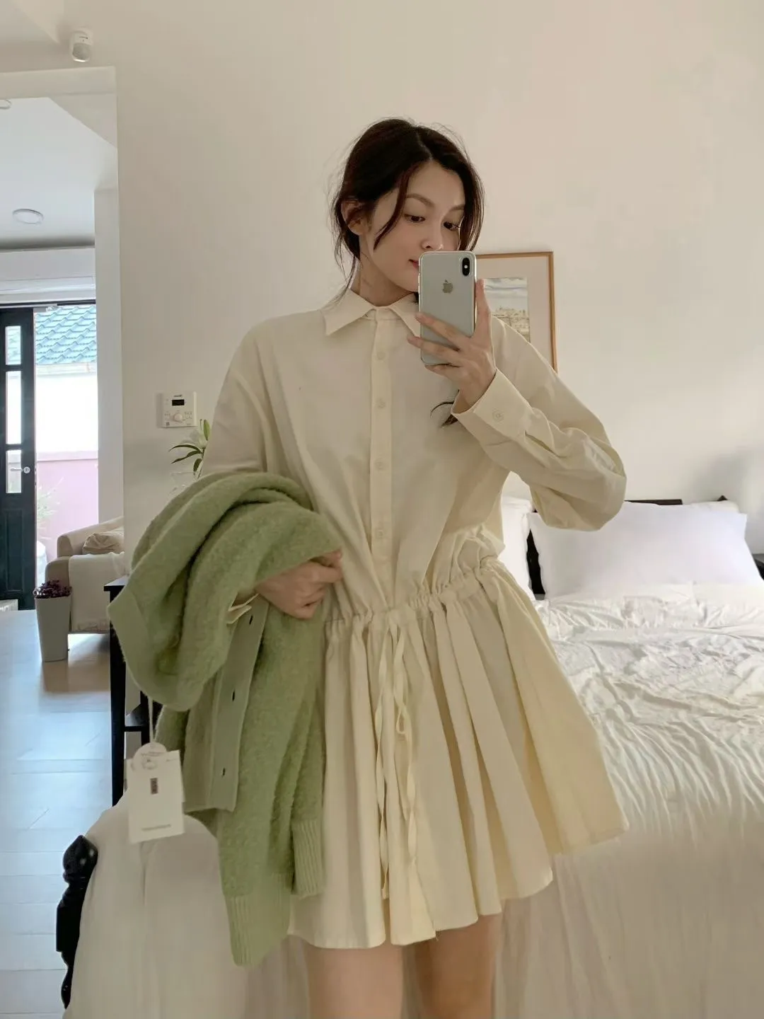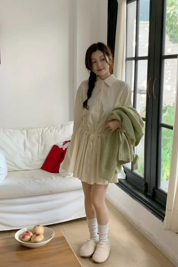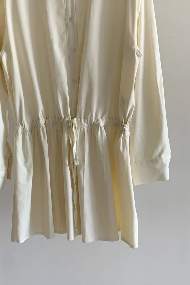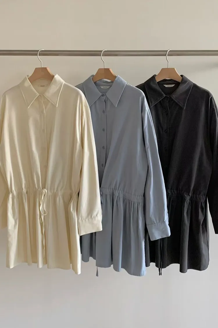 C01小尖領襯衫綁帶設計細絨長袖洋裝
