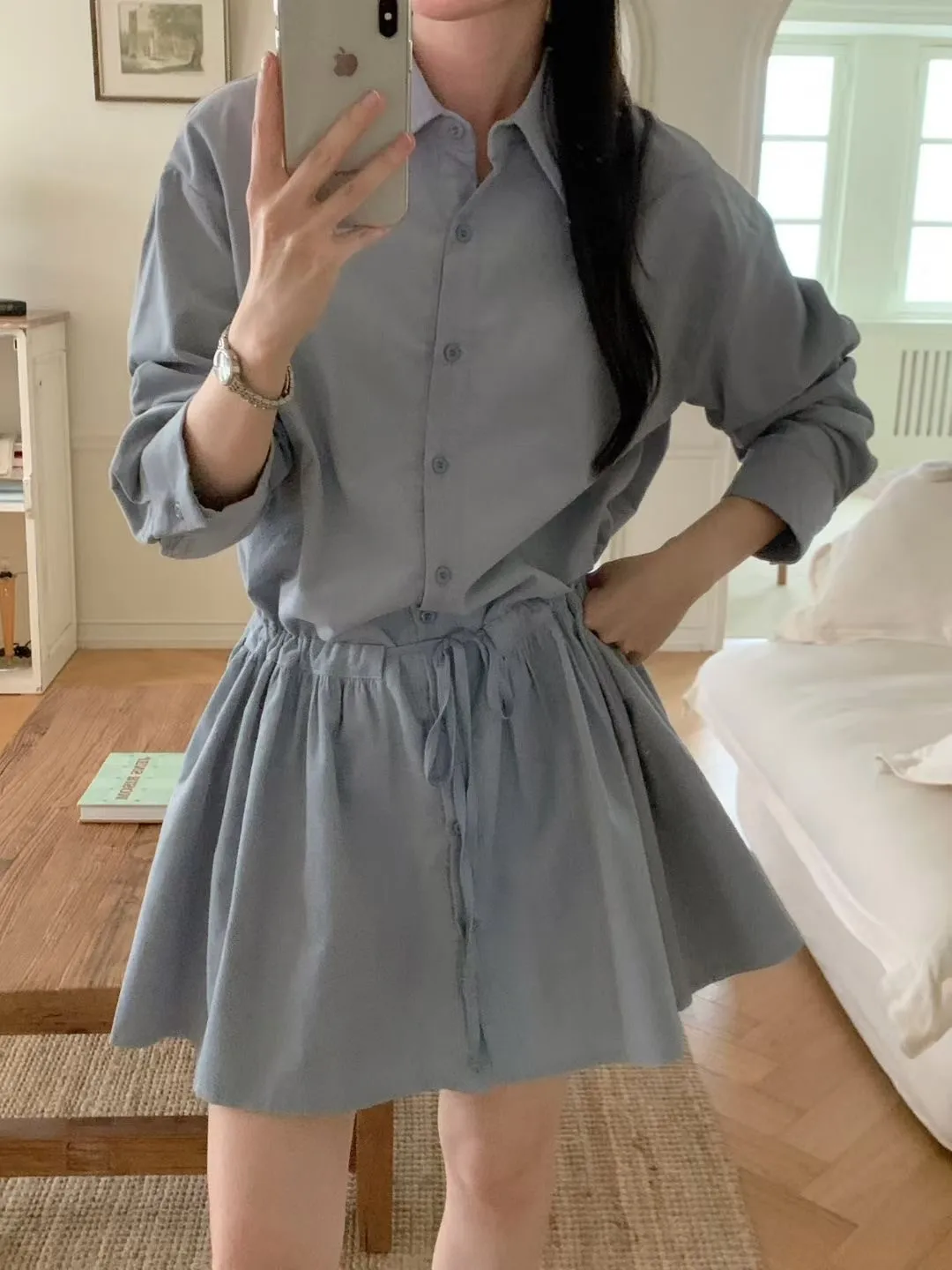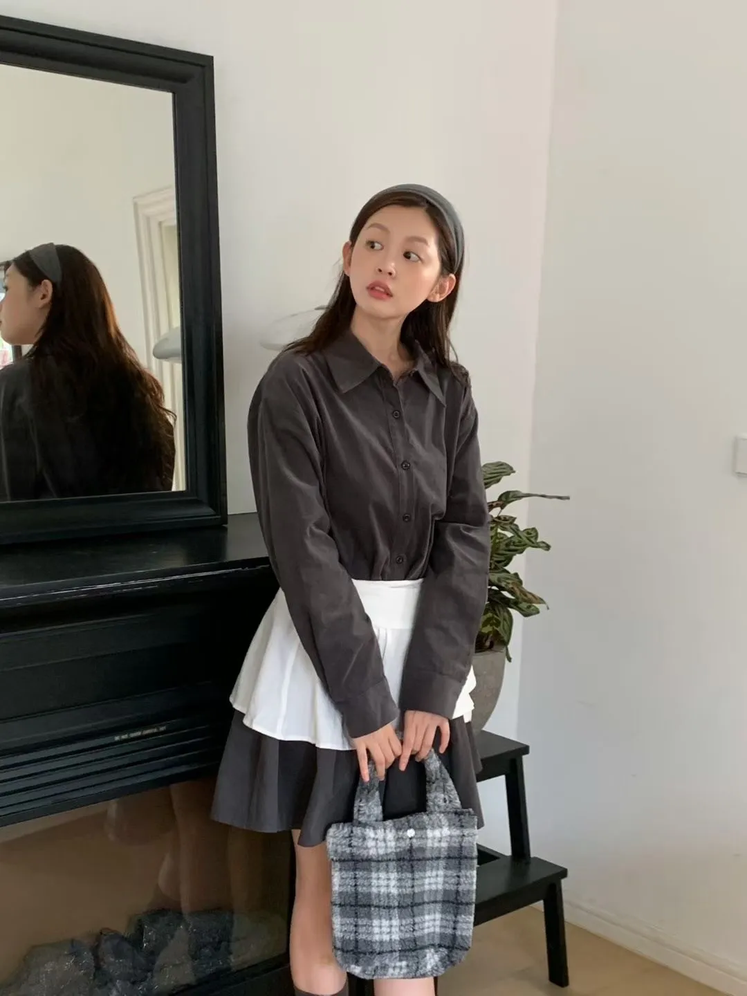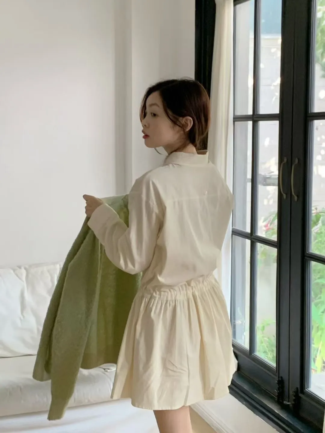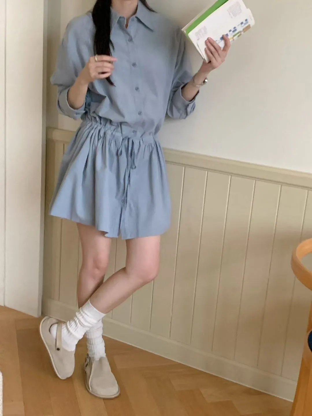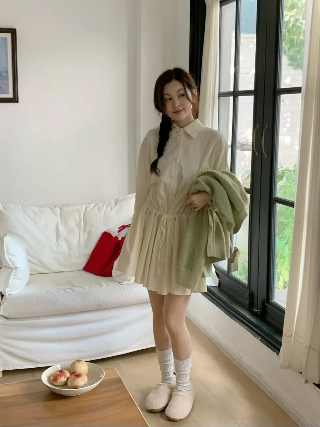 C01小尖領襯衫綁帶設計細絨長袖洋裝