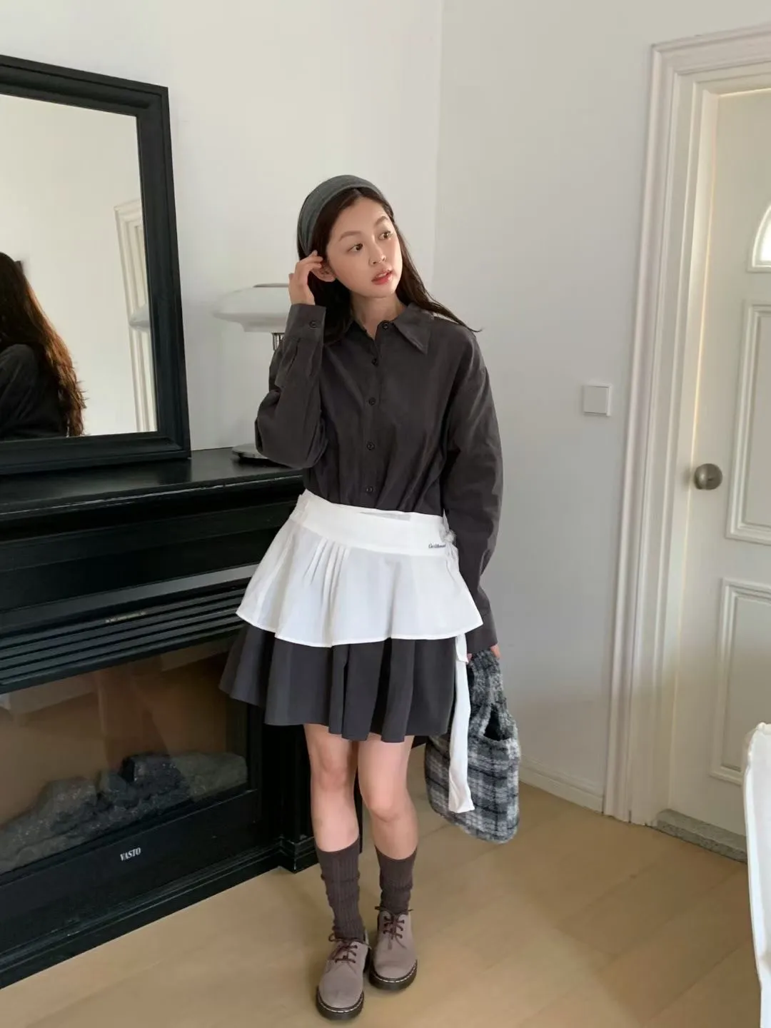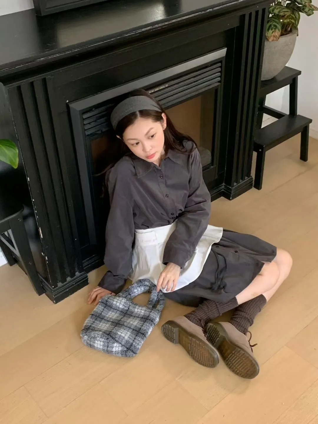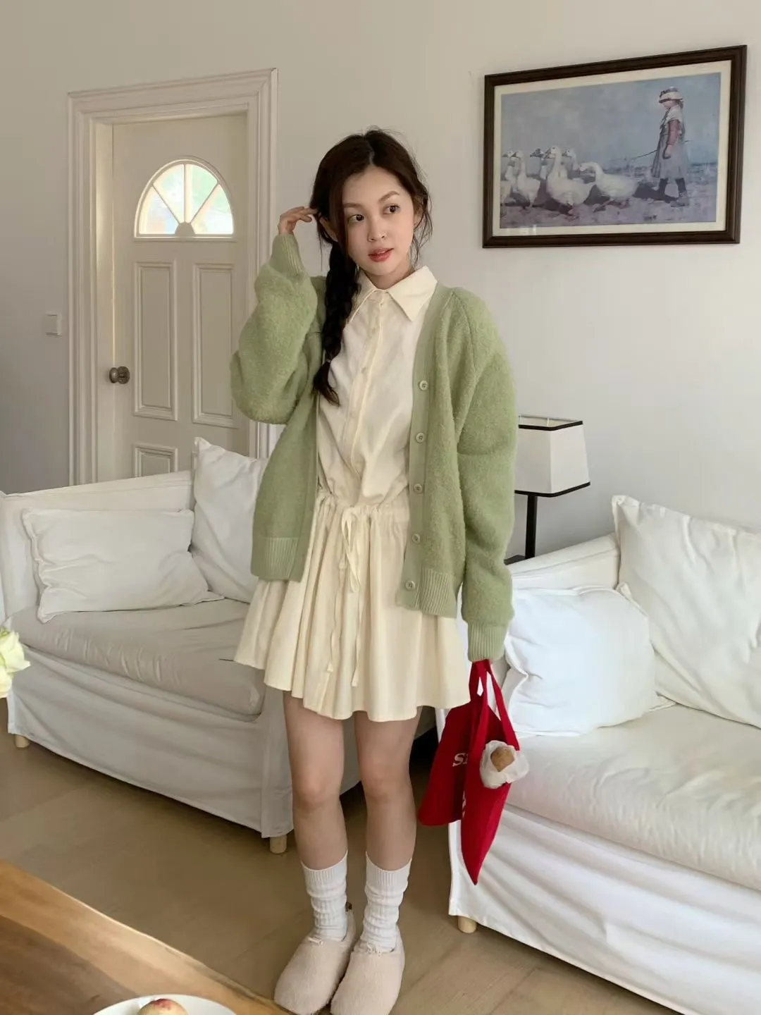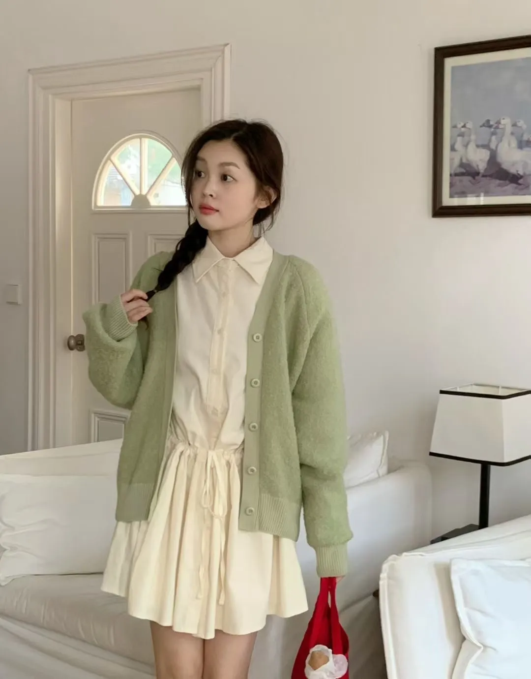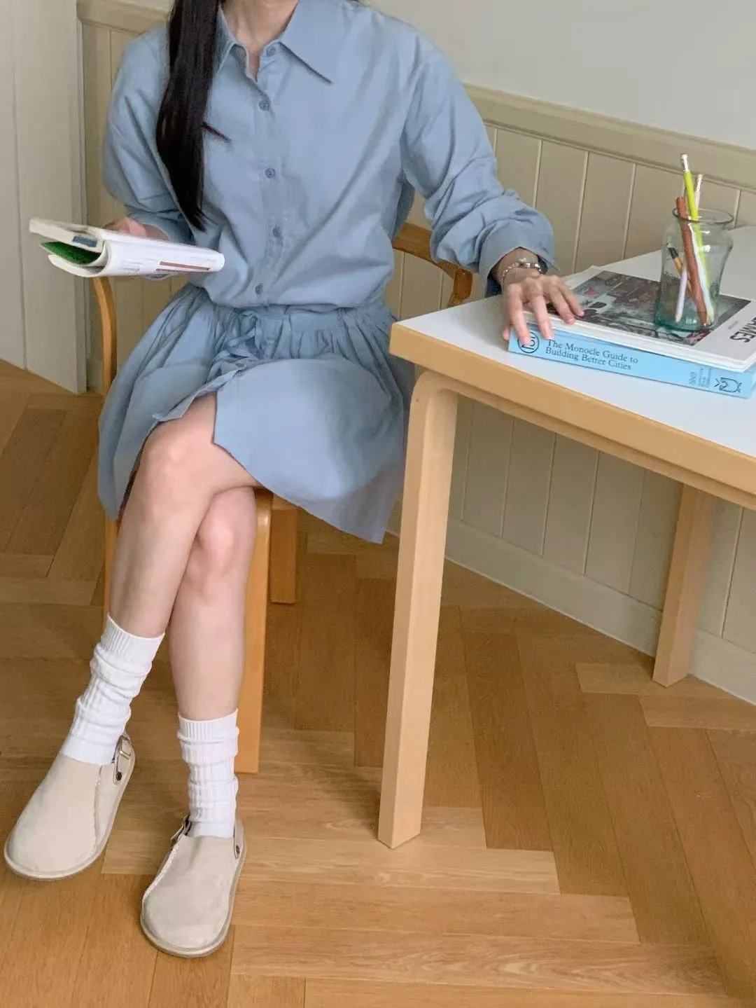 C01小尖領襯衫綁帶設計細絨長袖洋裝