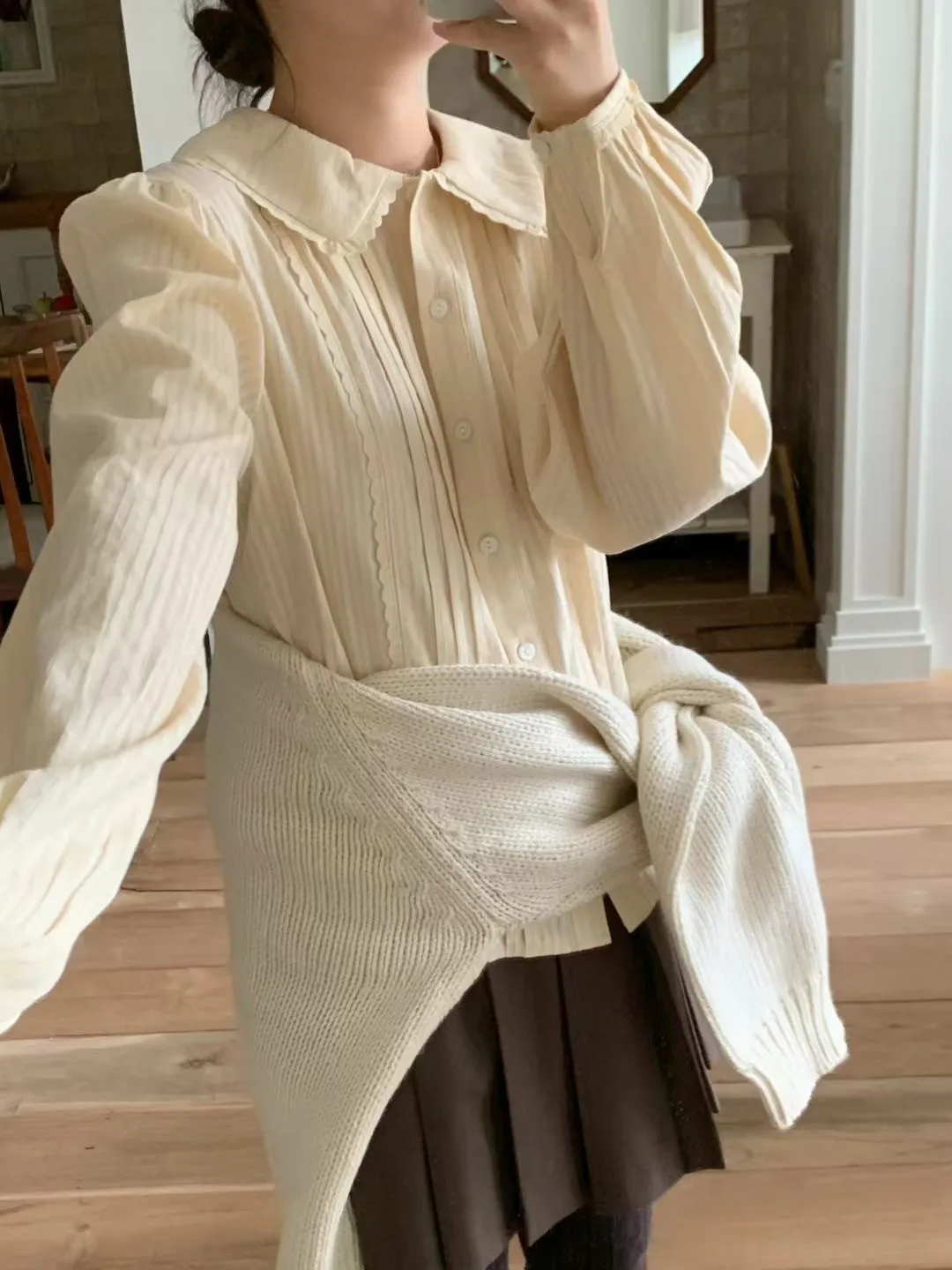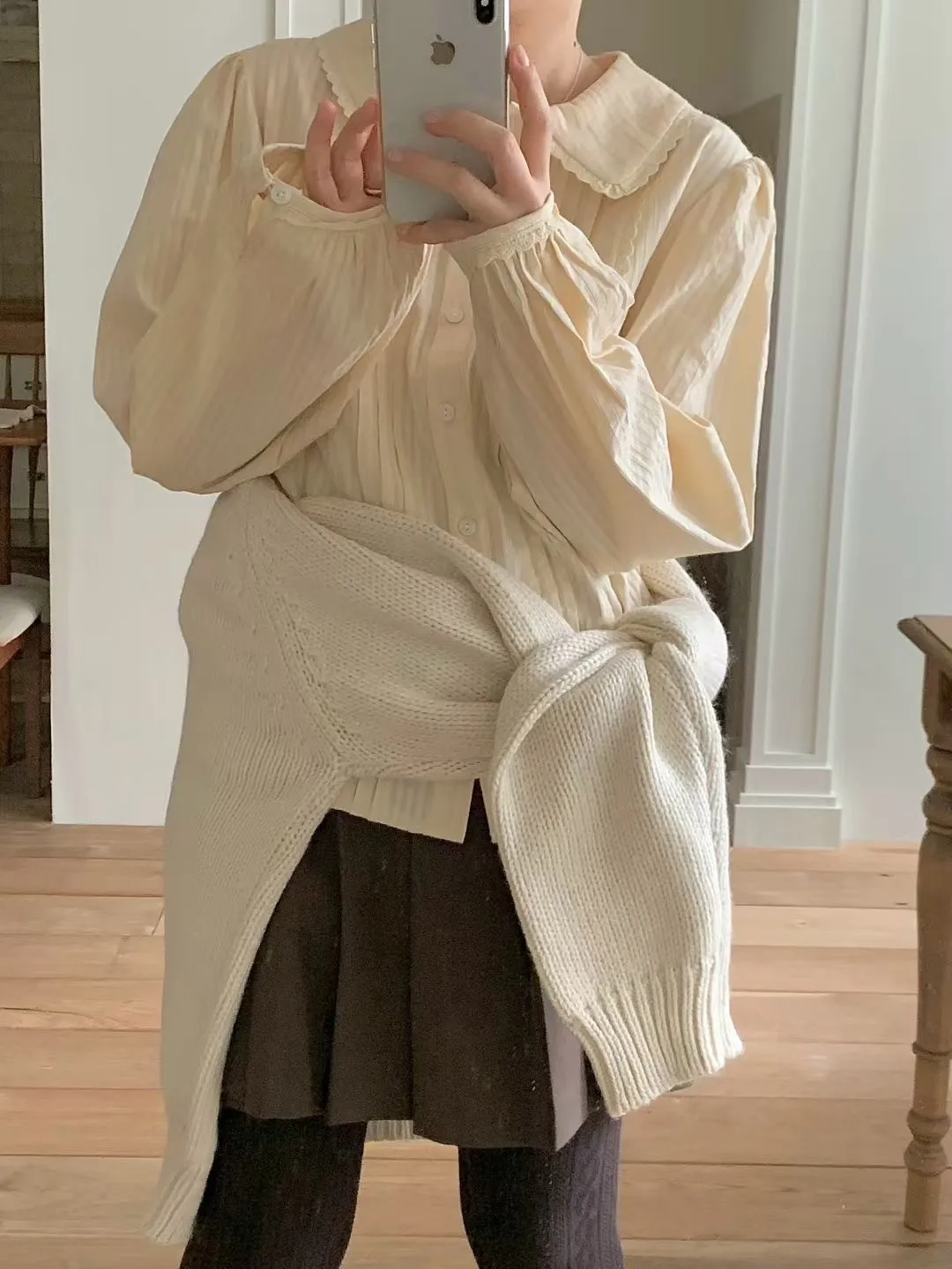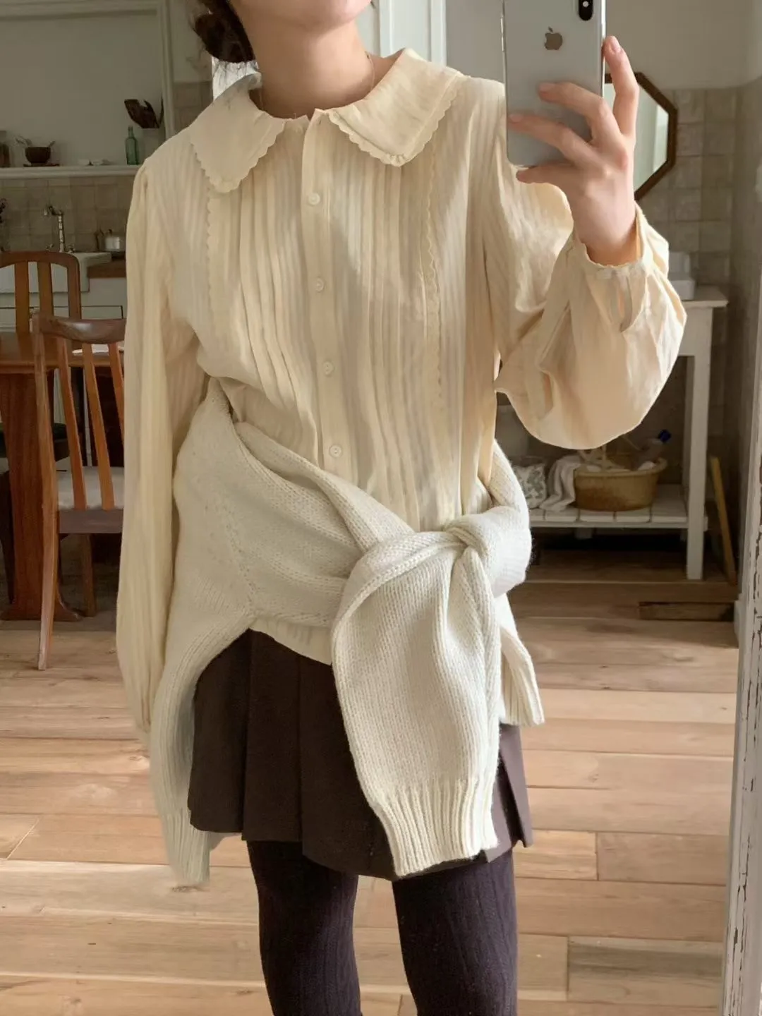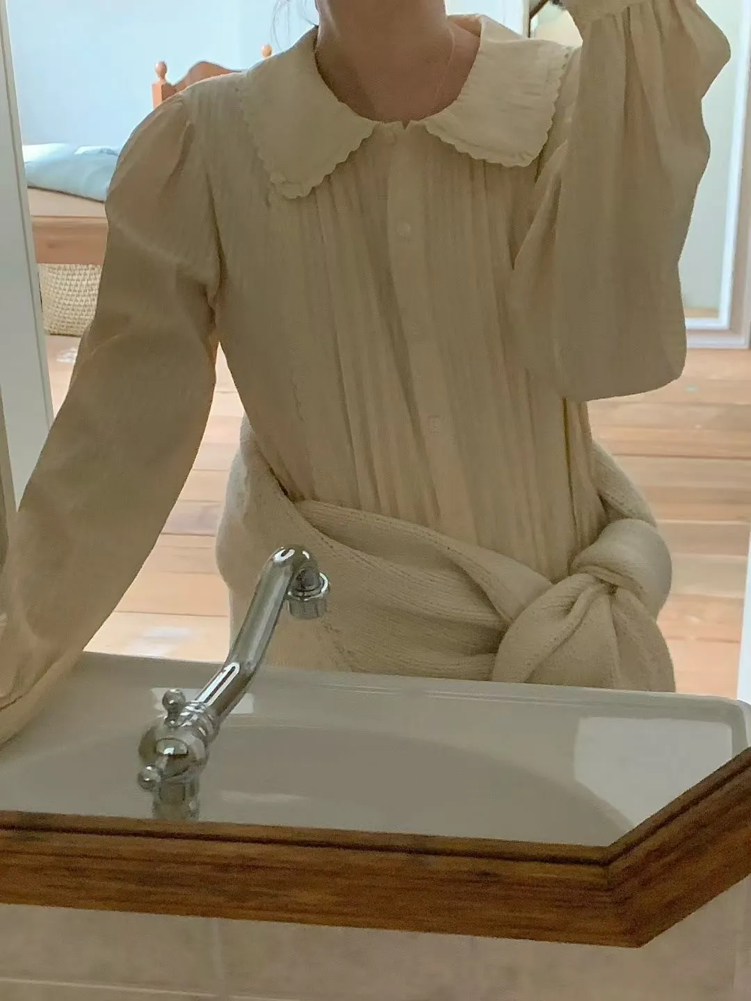 C09歐膩推薦!直條壓紋蕾絲滾邊長袖襯衫