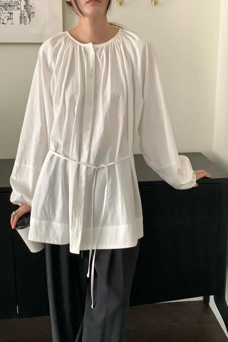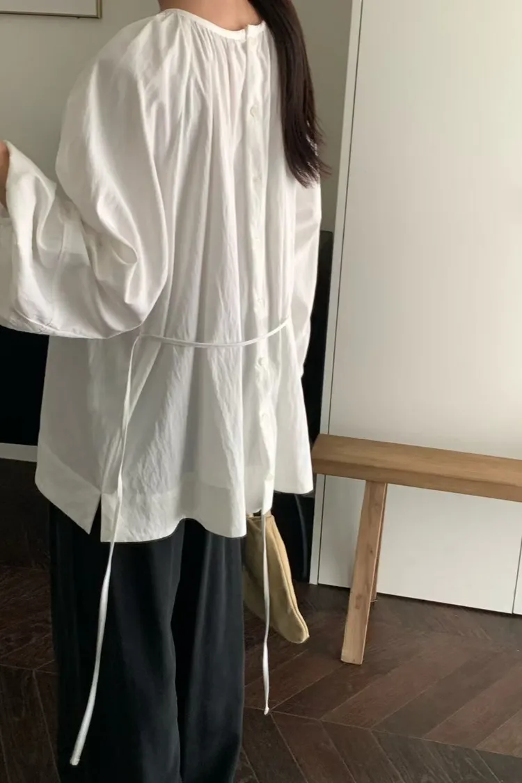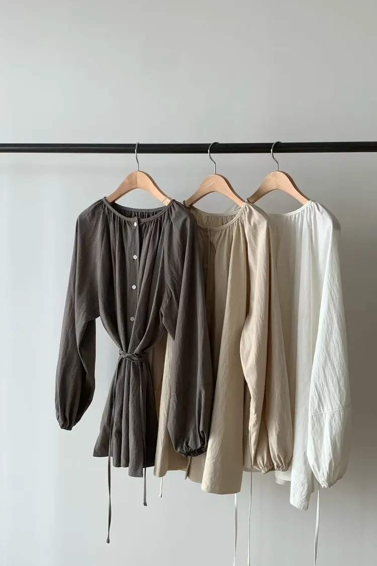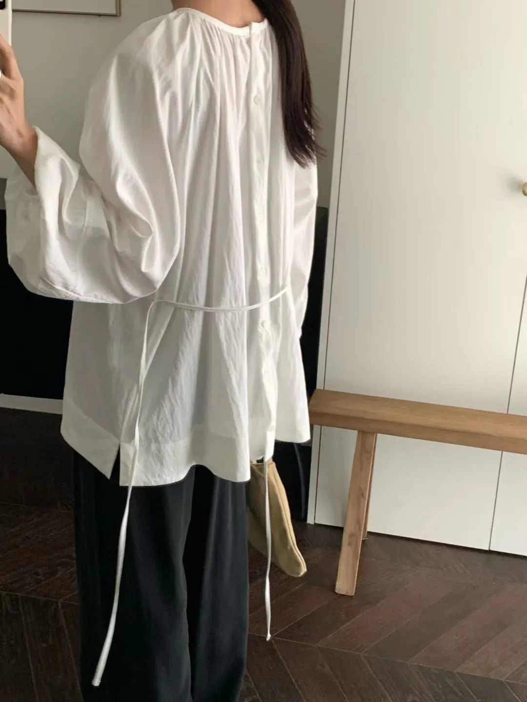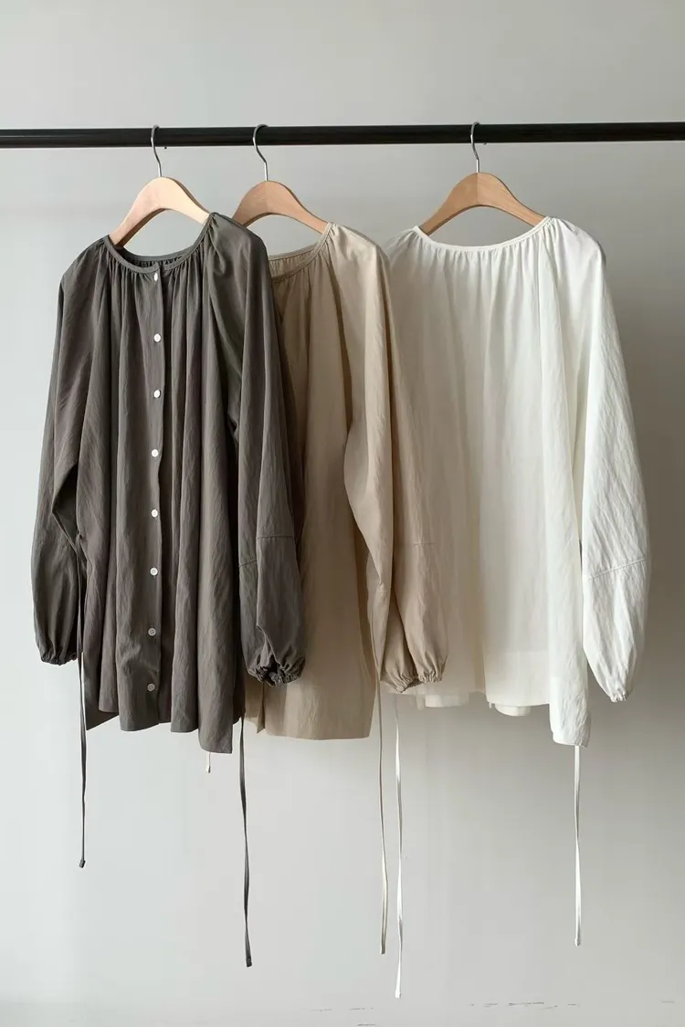 C44微甜浪漫小釦設計長版罩衫上衣/附綁帶