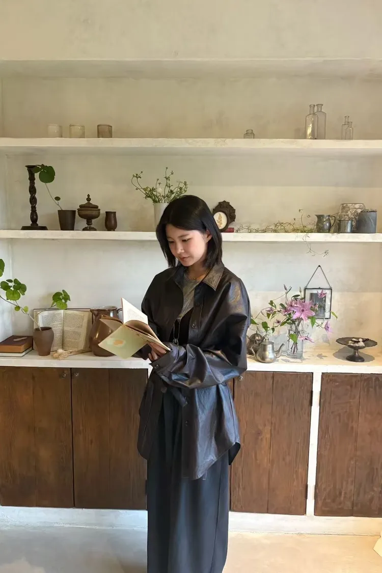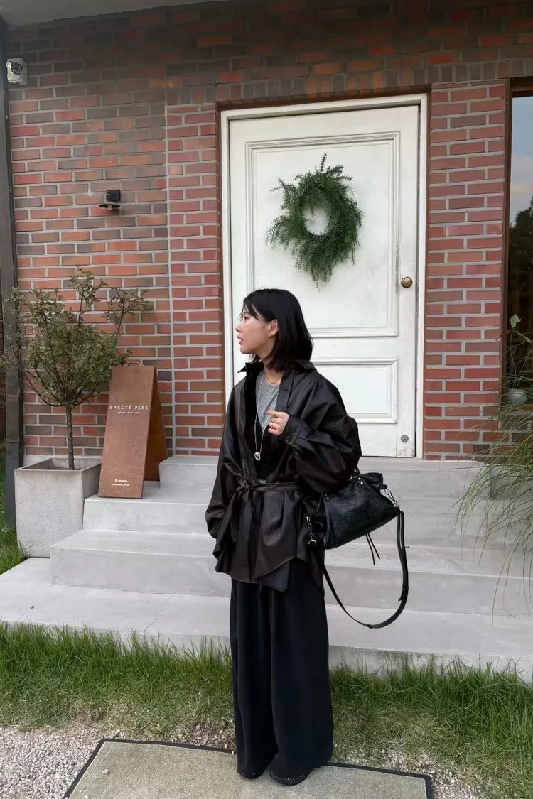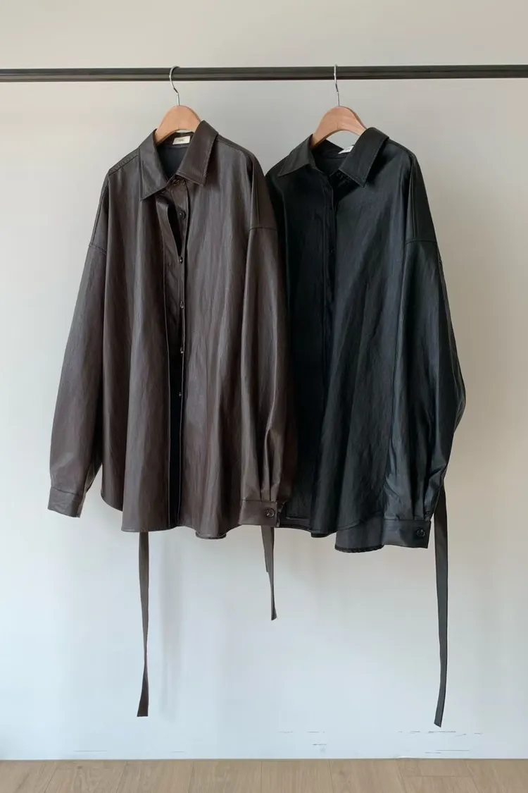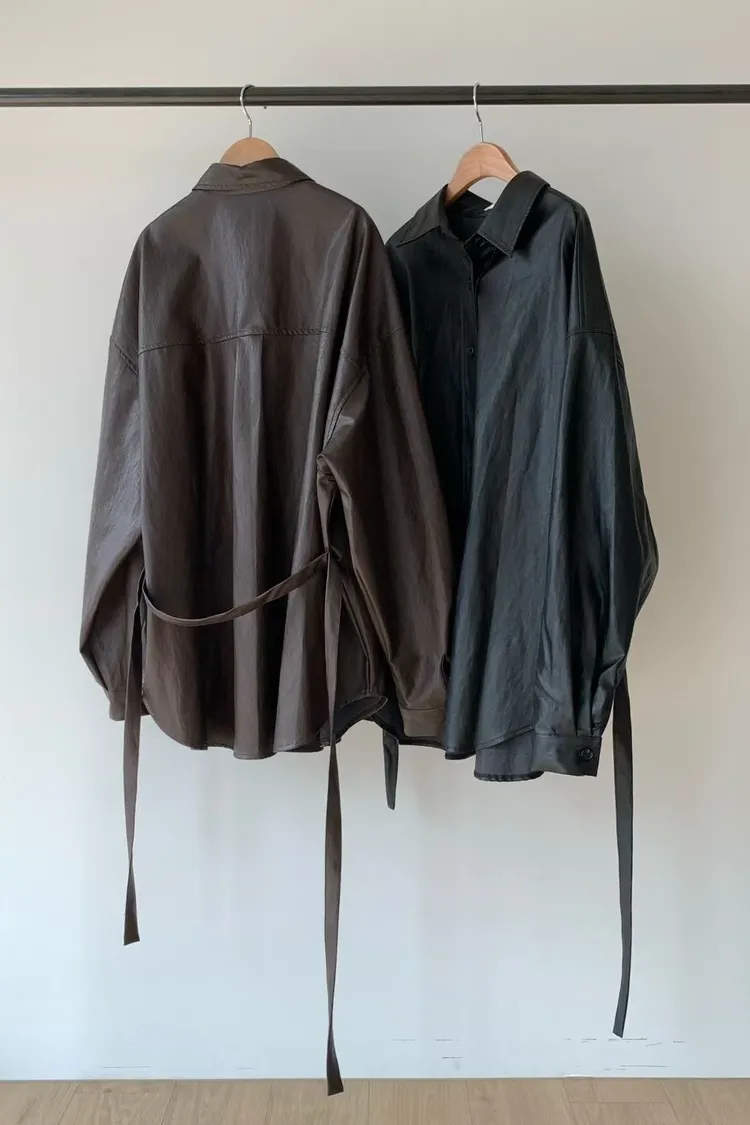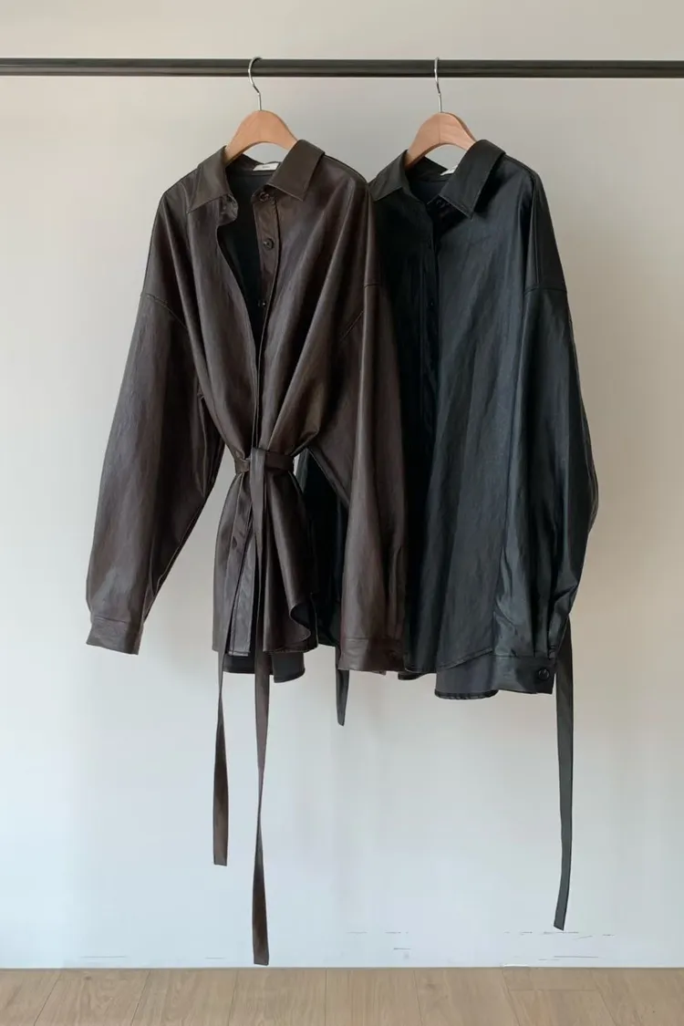 C51時髦韓妞的仿皮革休閒襯衫綁帶設計外套