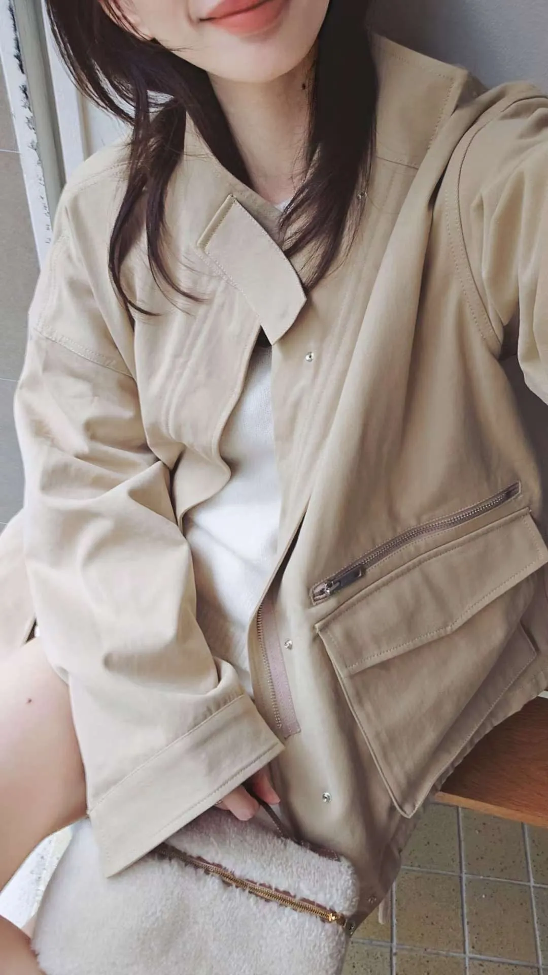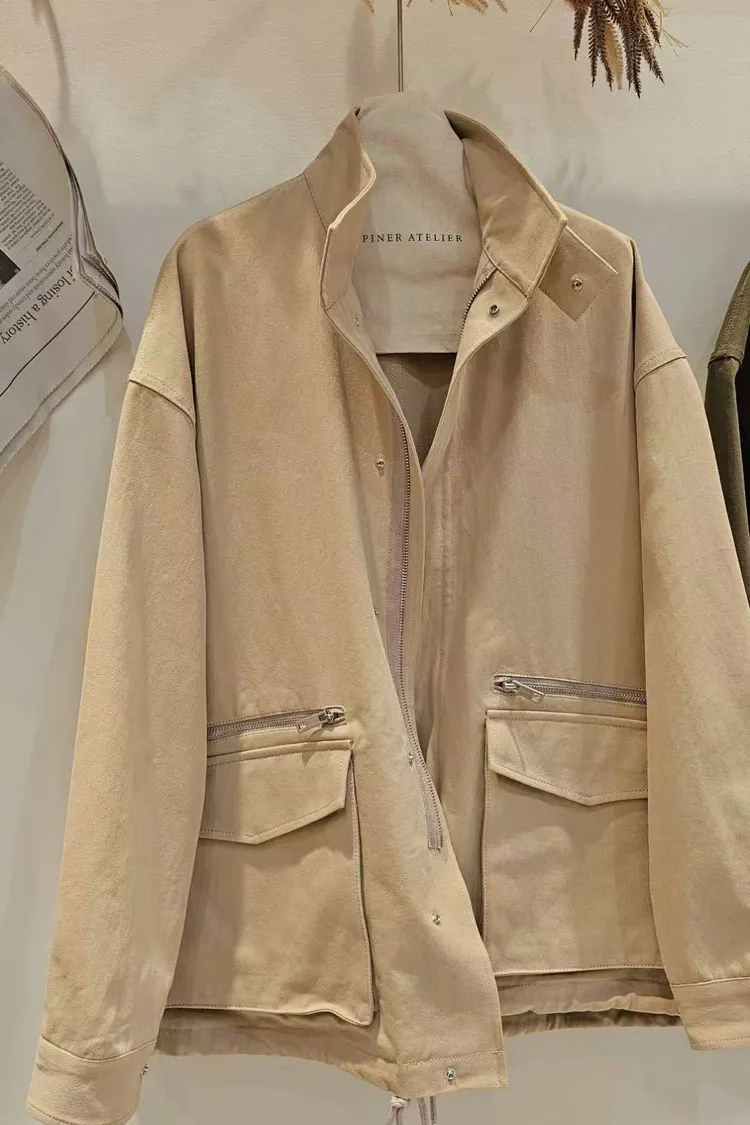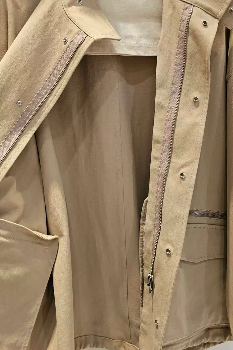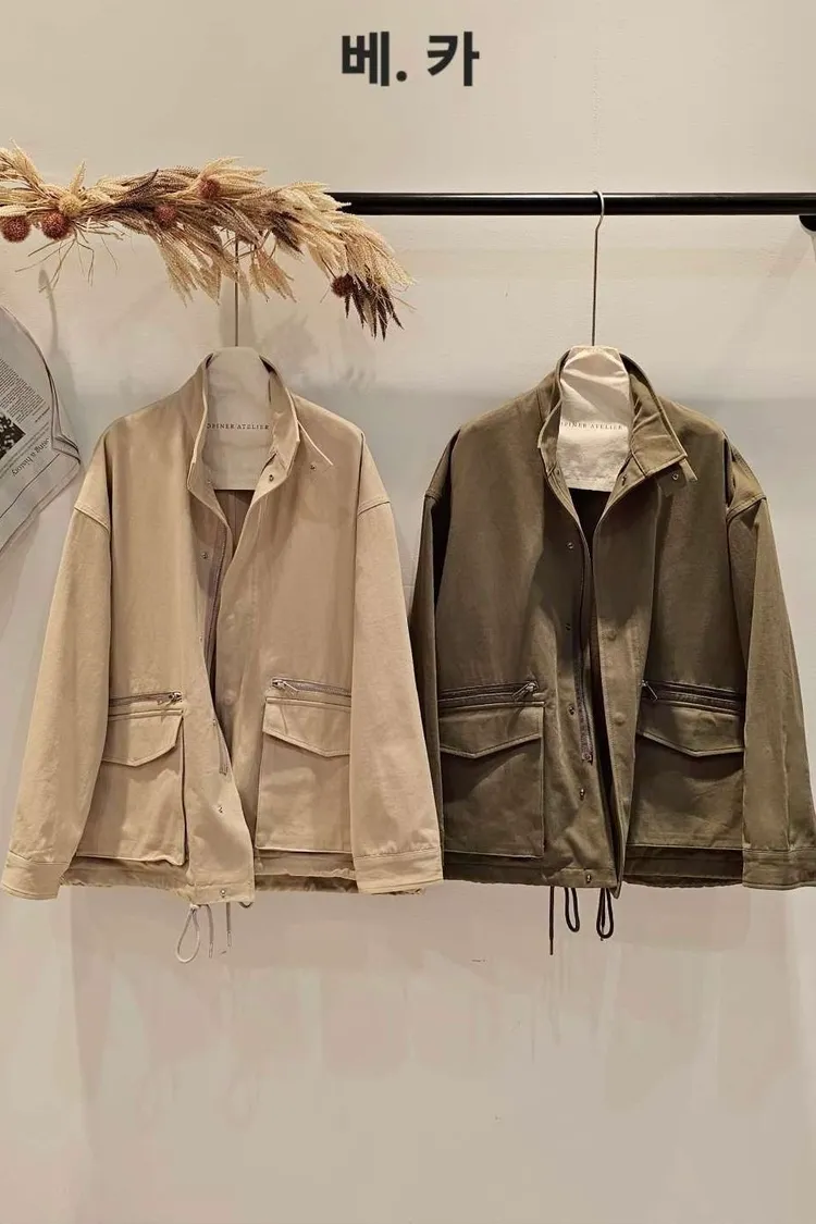 下擺有抽繩,小立領,蓋袋口袋+拉鍊口袋