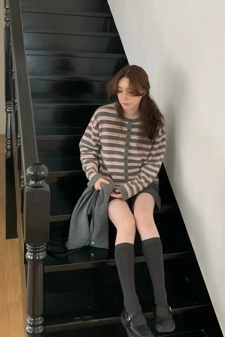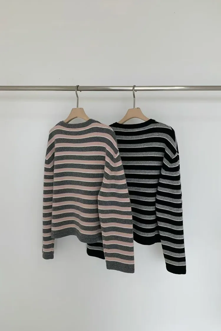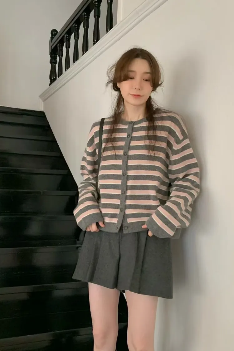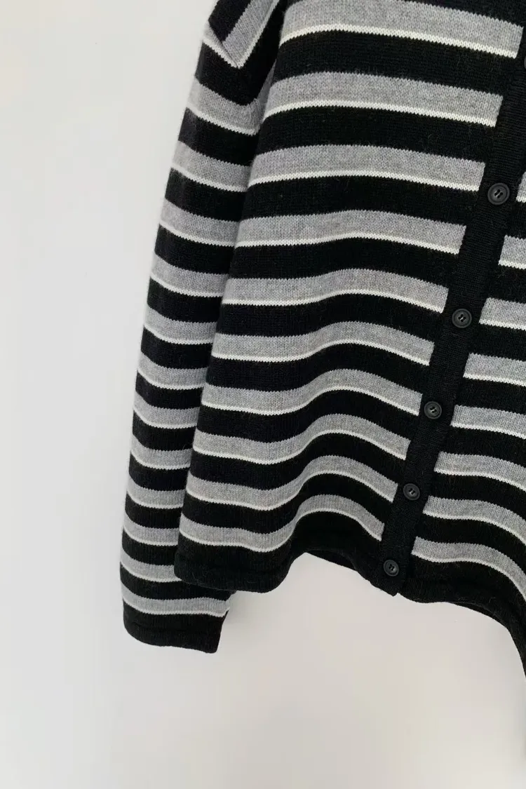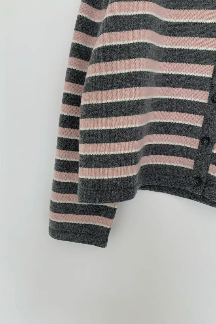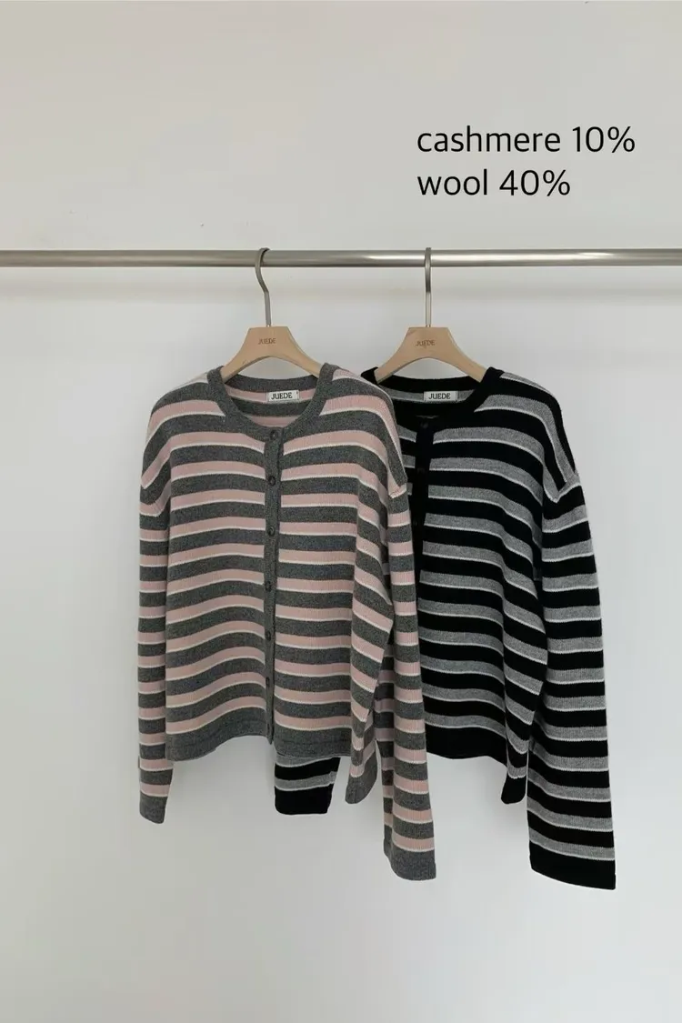 D23精緻韓國小姐姐克什米爾羊毛條紋毛衣外套