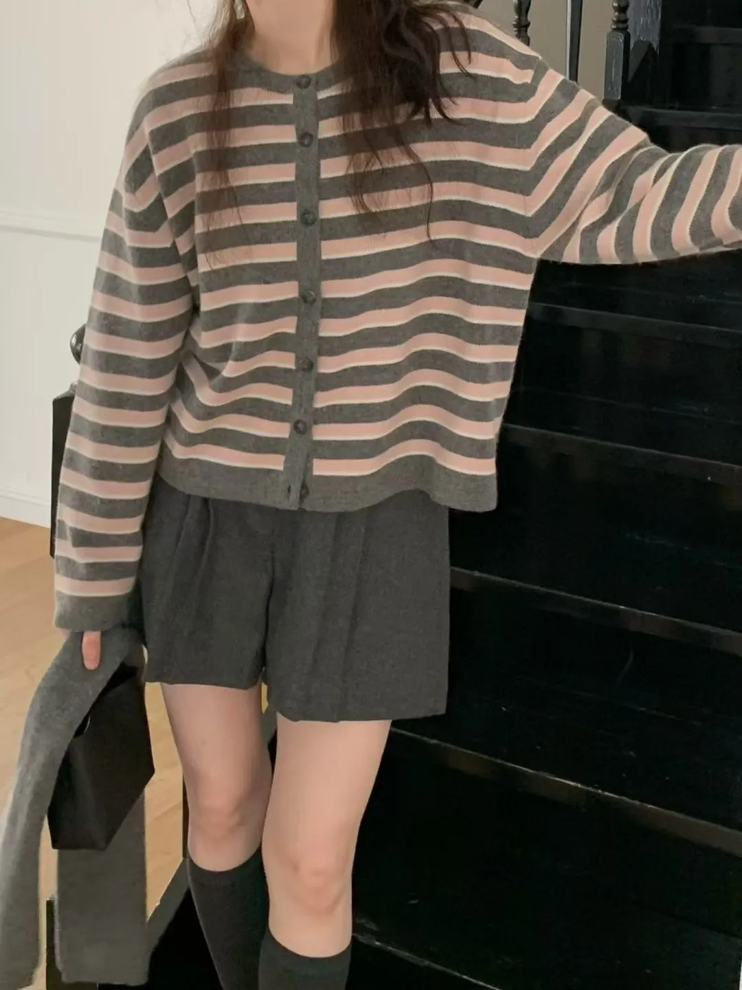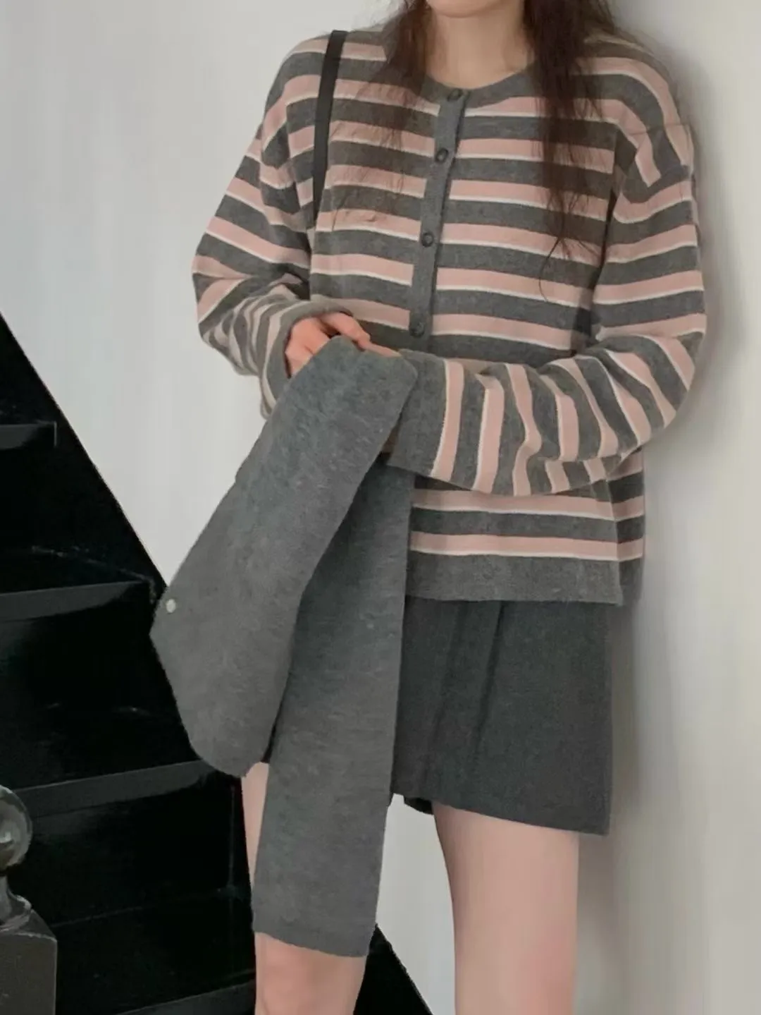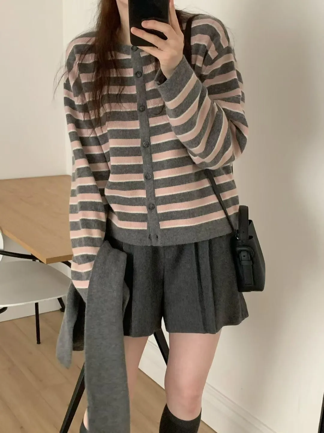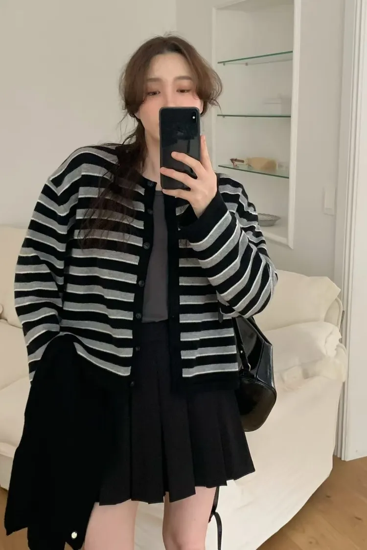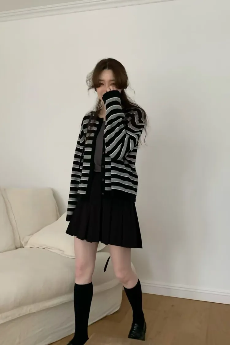 D23精緻韓國小姐姐克什米爾羊毛條紋毛衣外套
