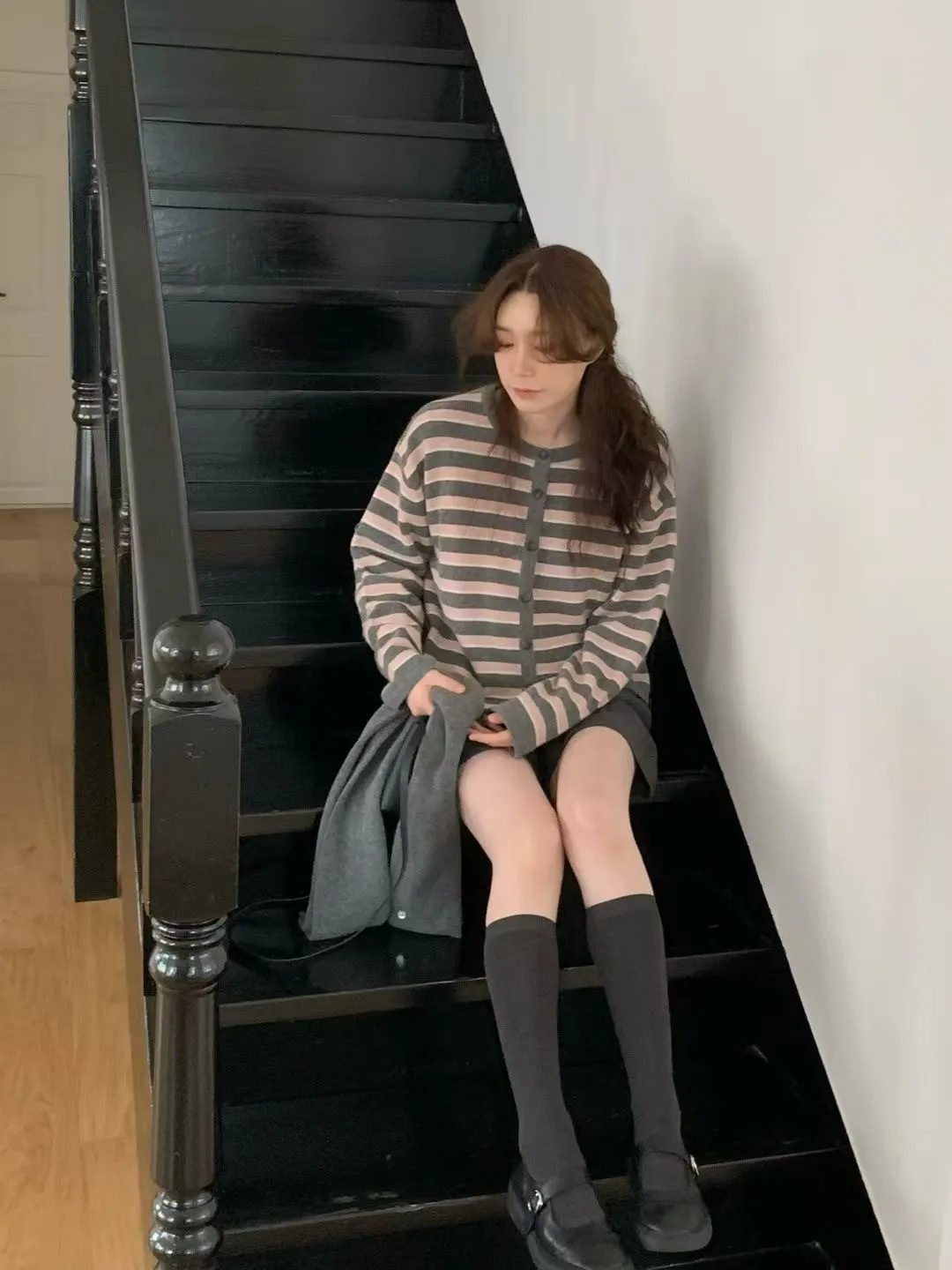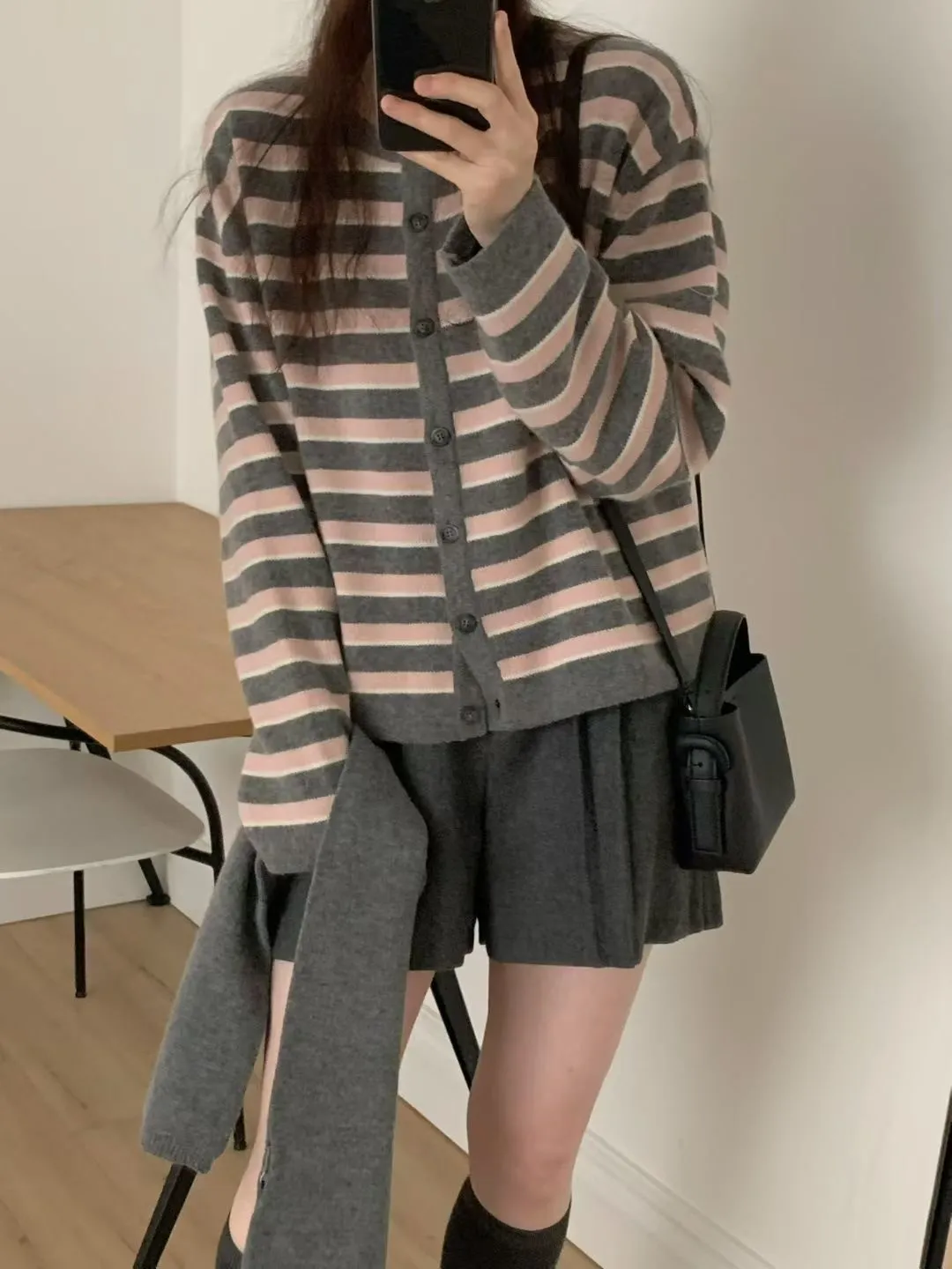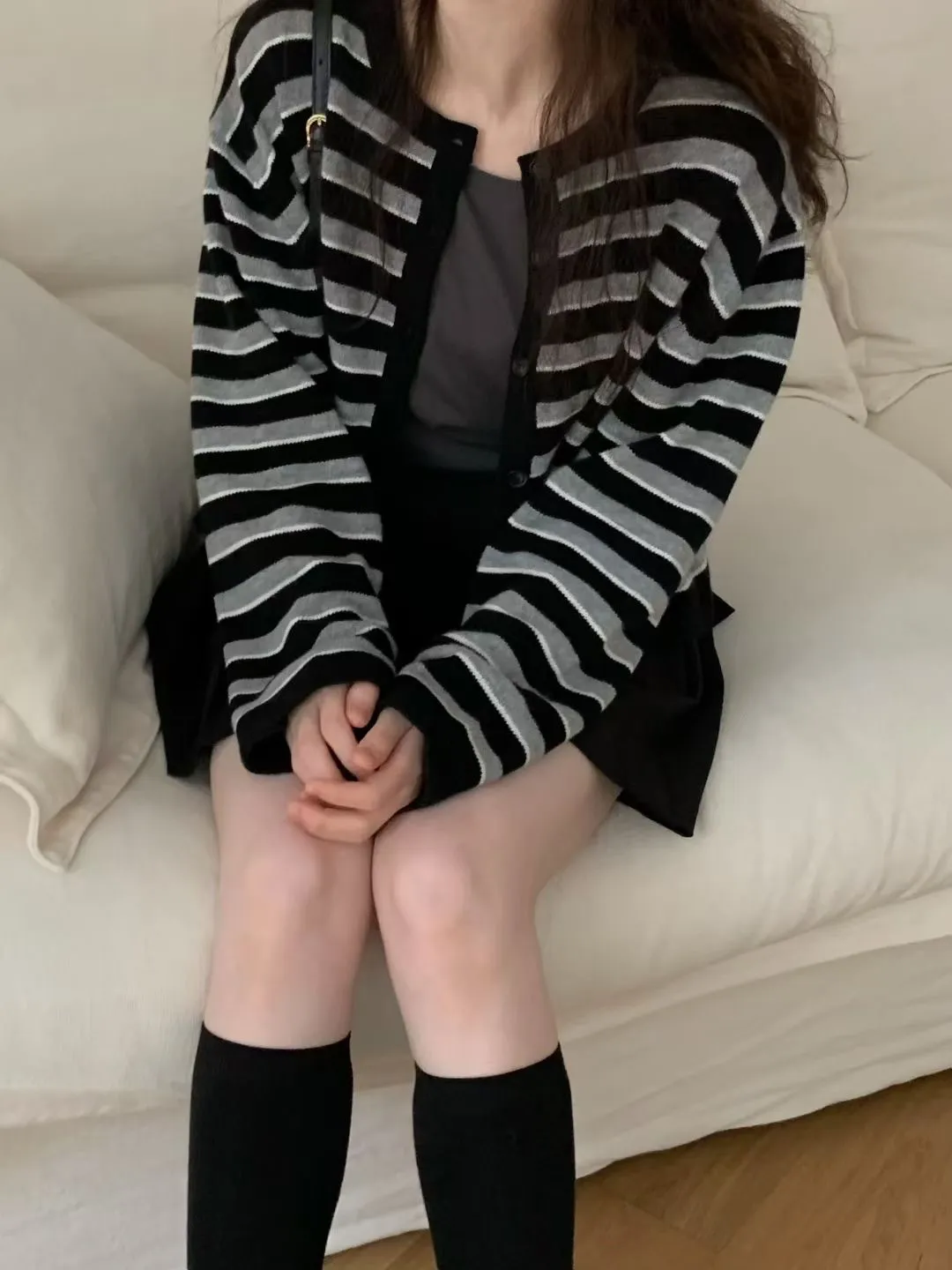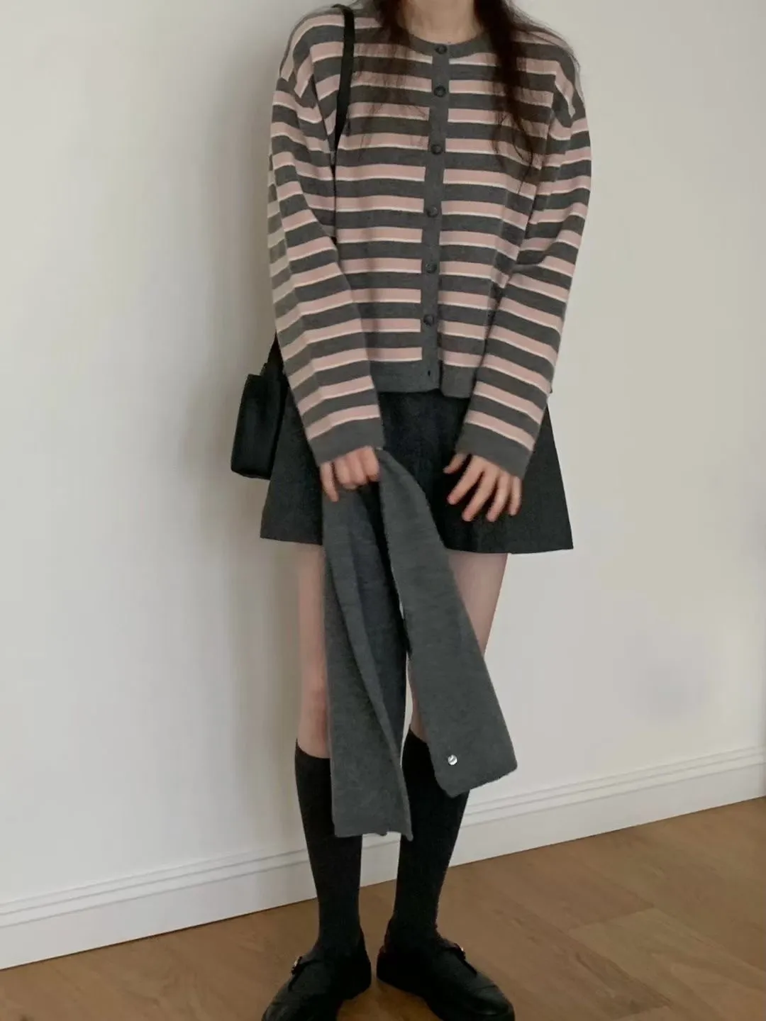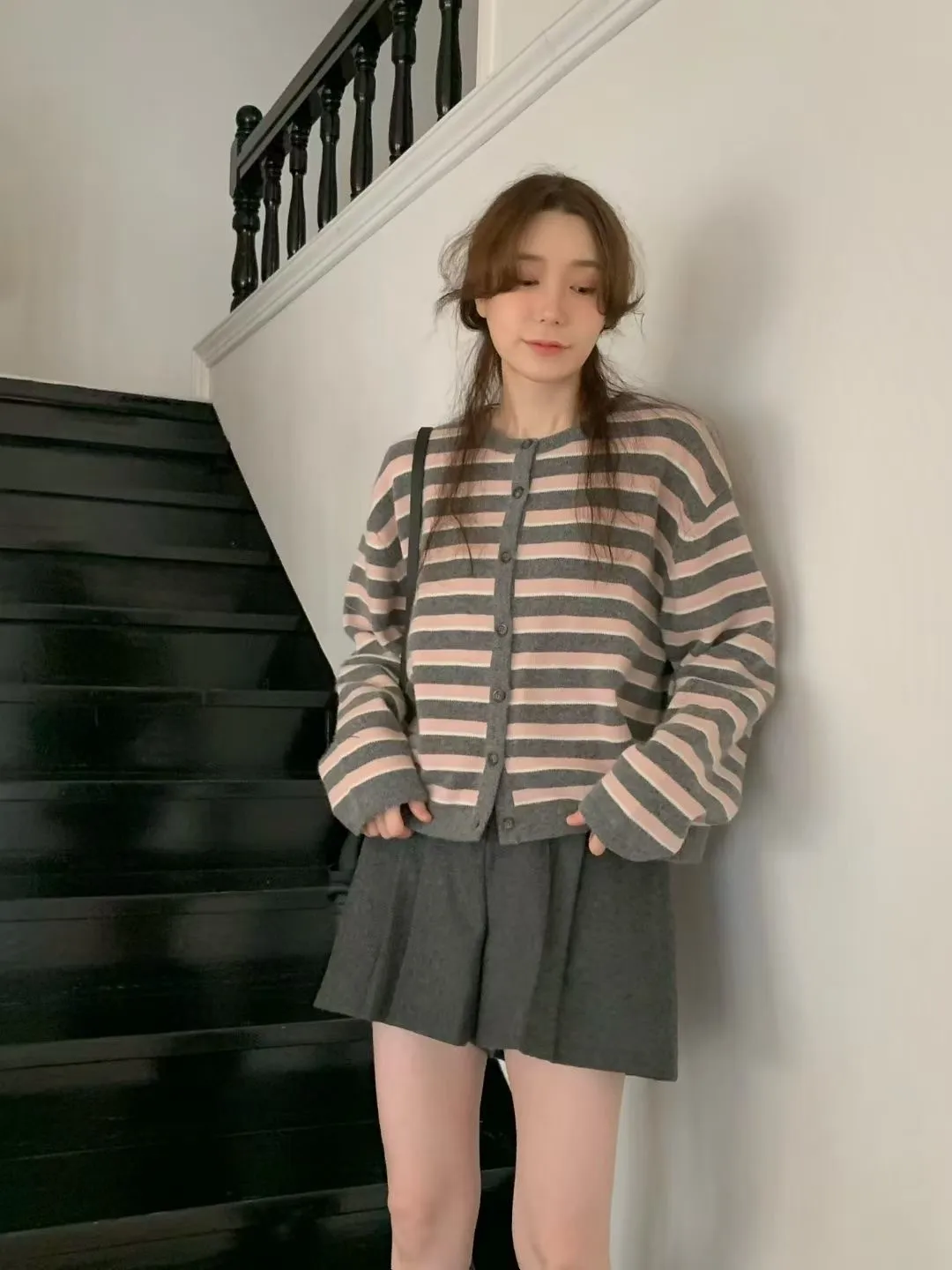 D23精緻韓國小姐姐克什米爾羊毛條紋毛衣外套