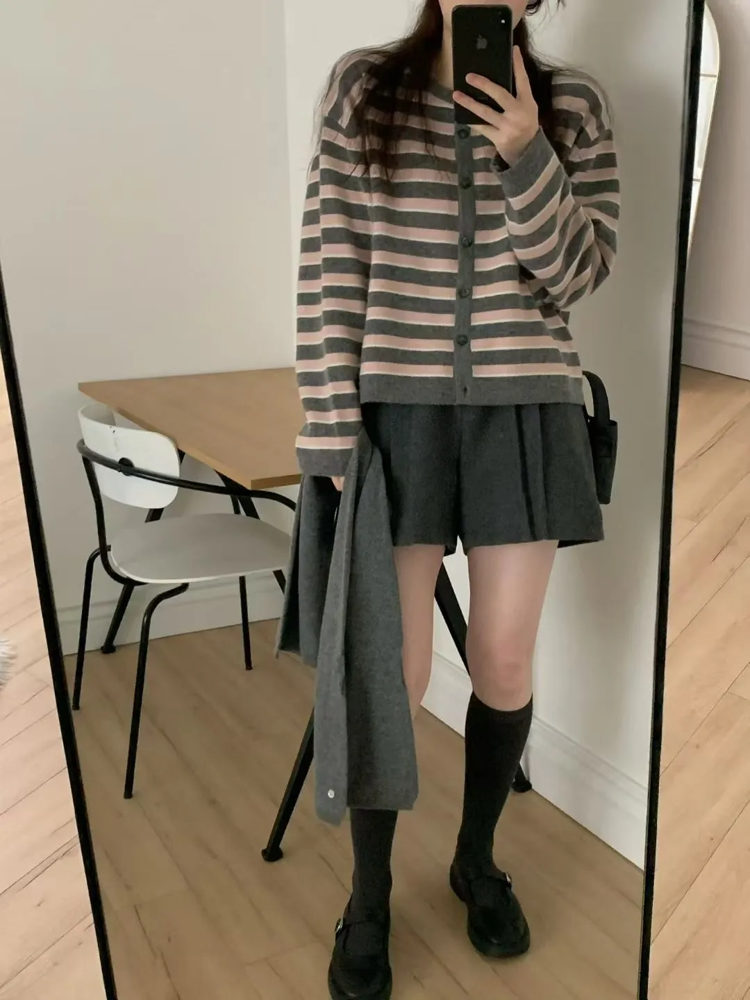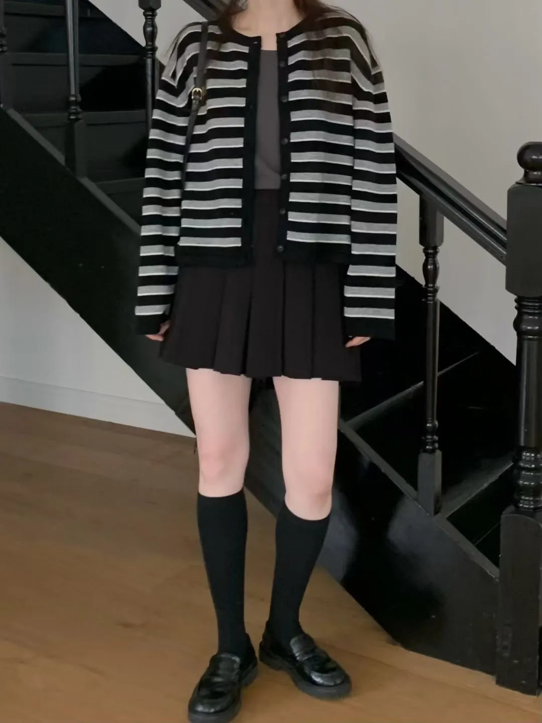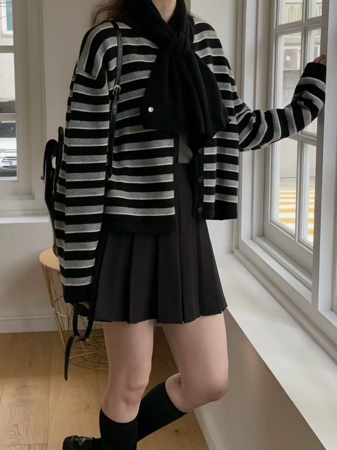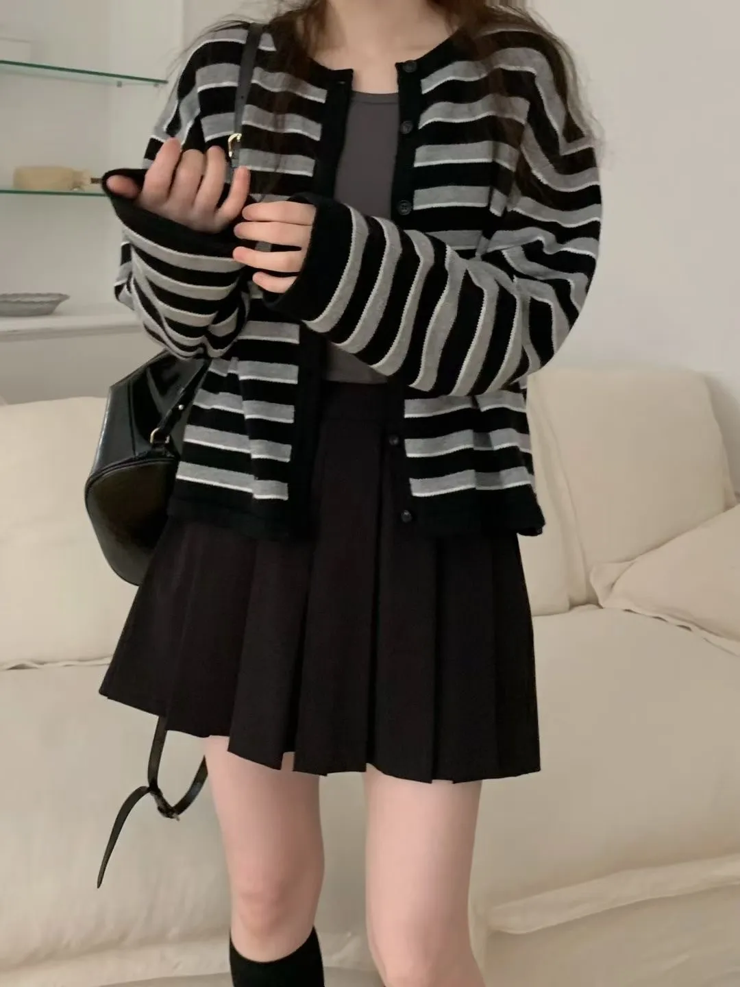 D23精緻韓國小姐姐克什米爾羊毛條紋毛衣外套