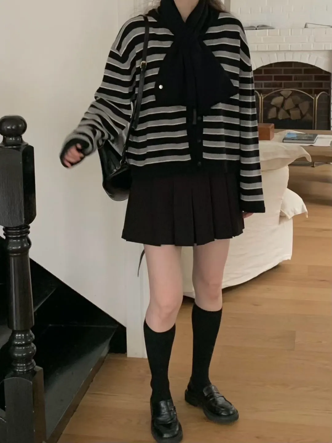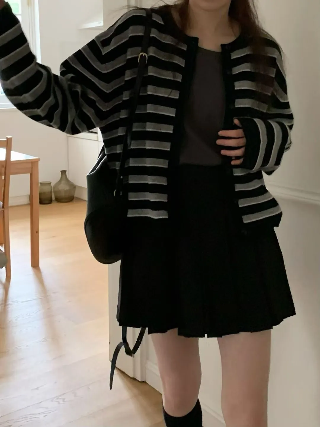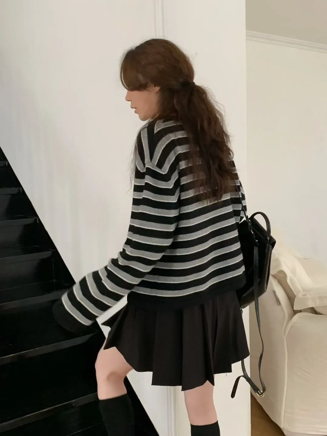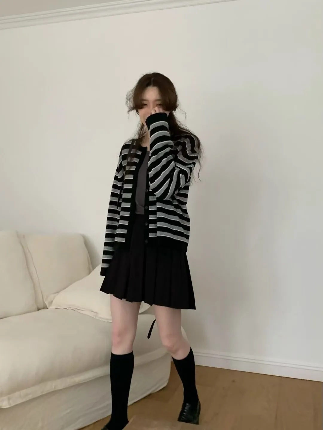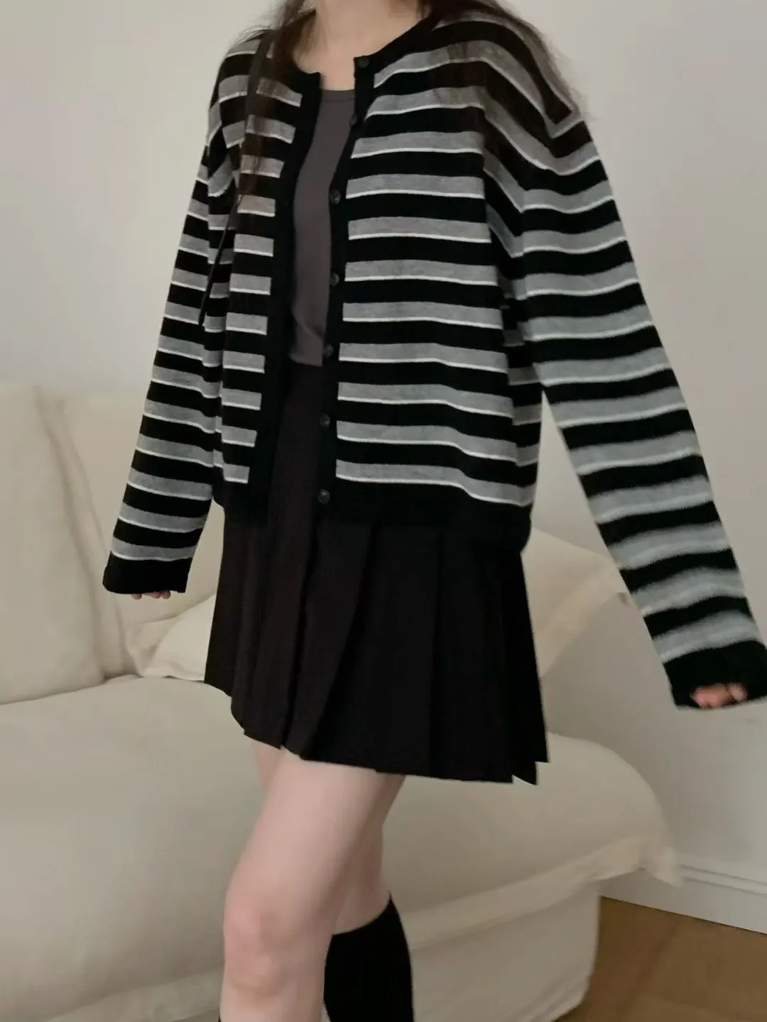 D23精緻韓國小姐姐克什米爾羊毛條紋毛衣外套
