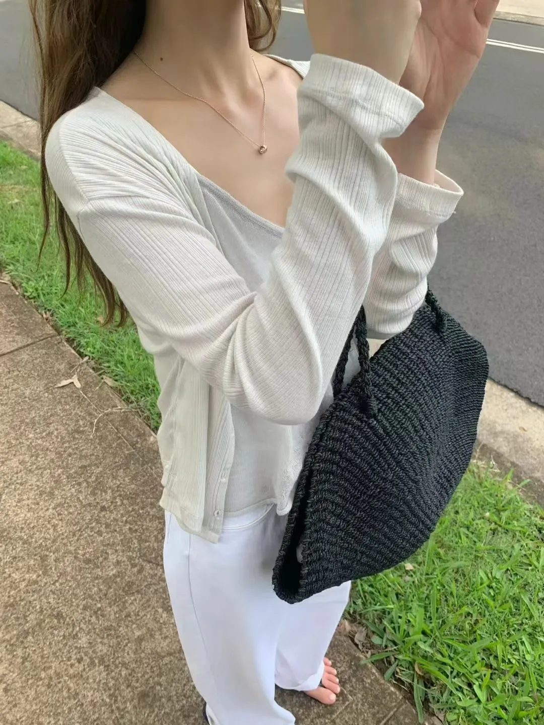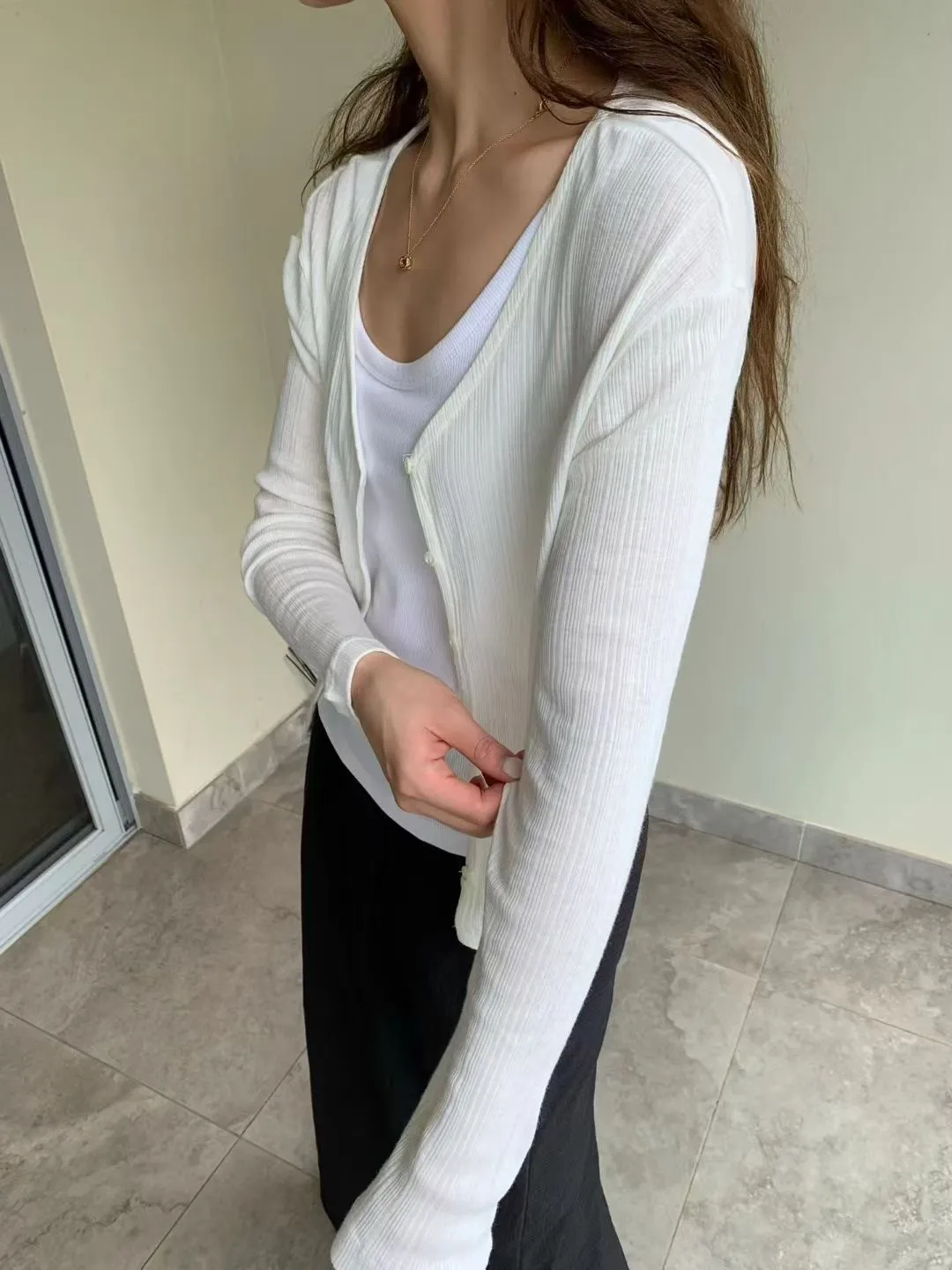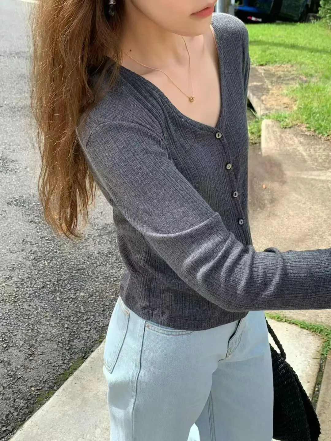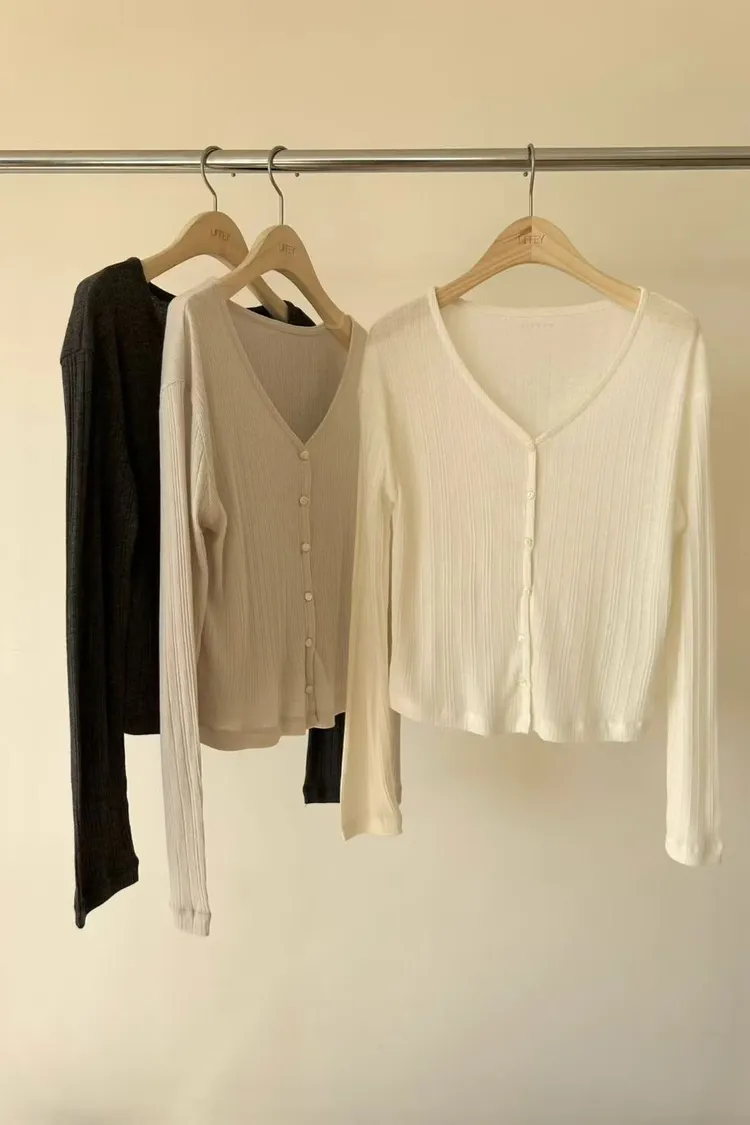 A09人氣*法式簡約線條感壓紋V領小釦上衣/外套