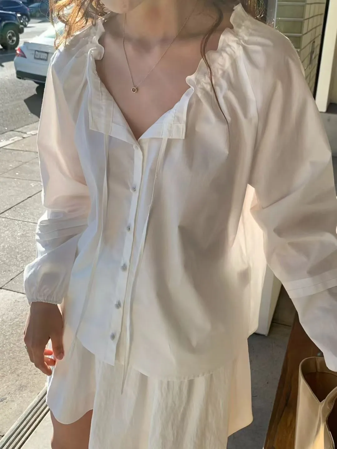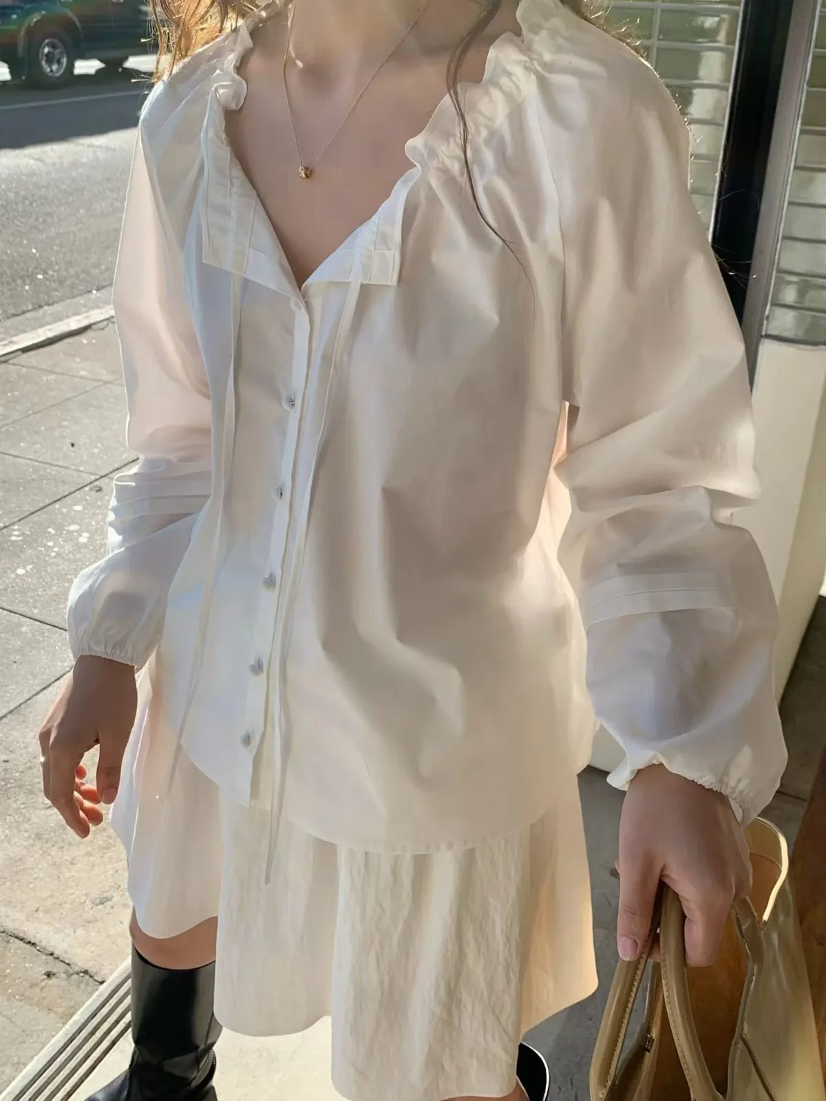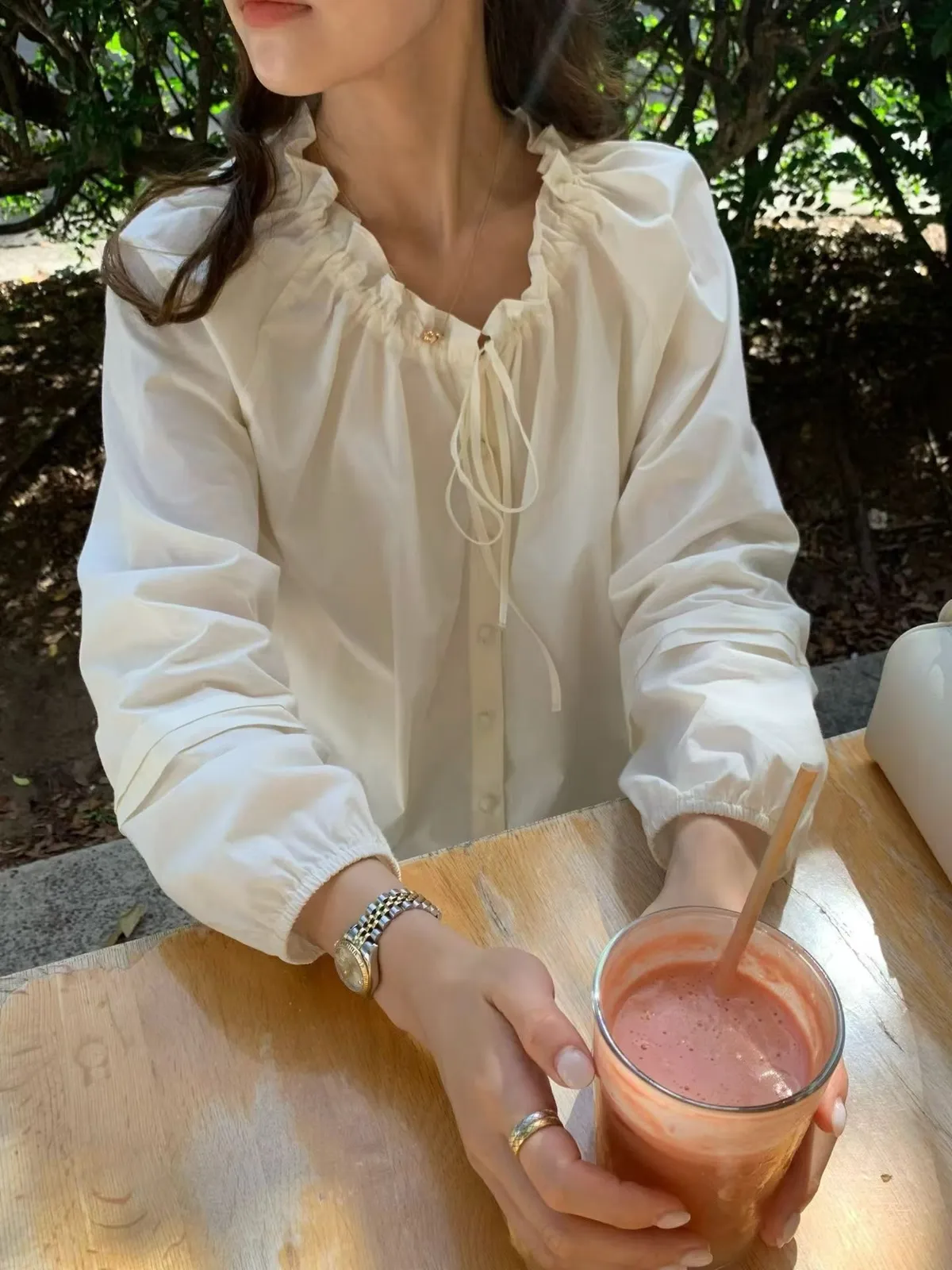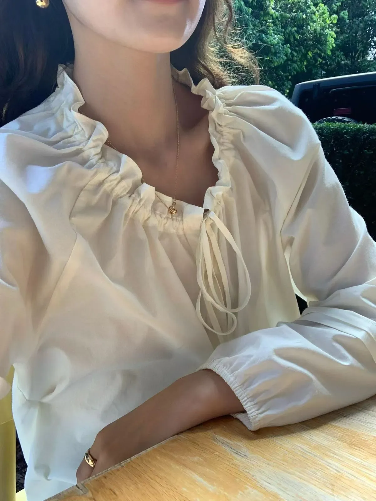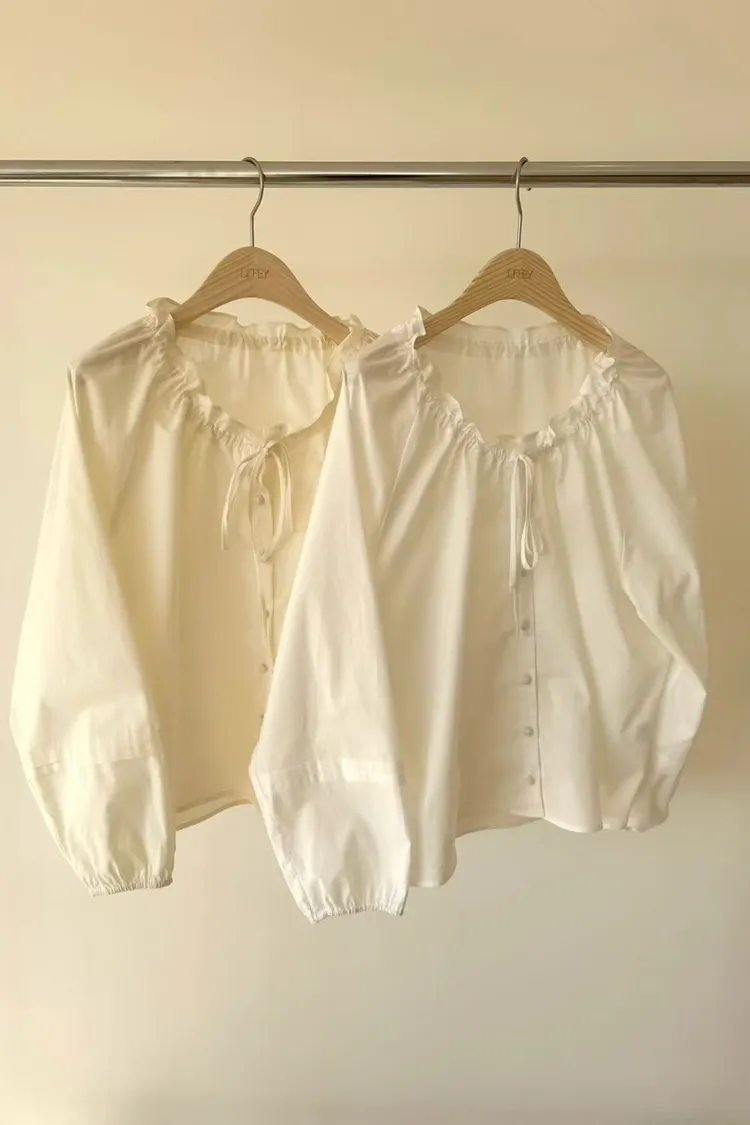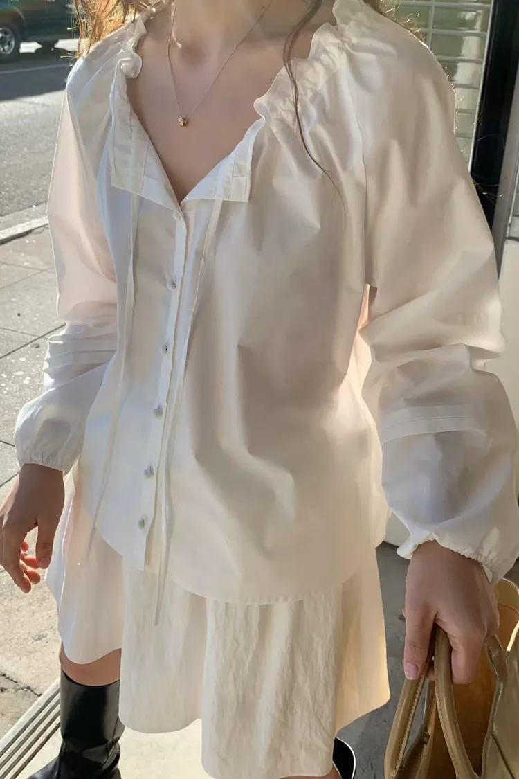 A11韓系小姊姊荷葉綁帶領多穿法罩衫上衣