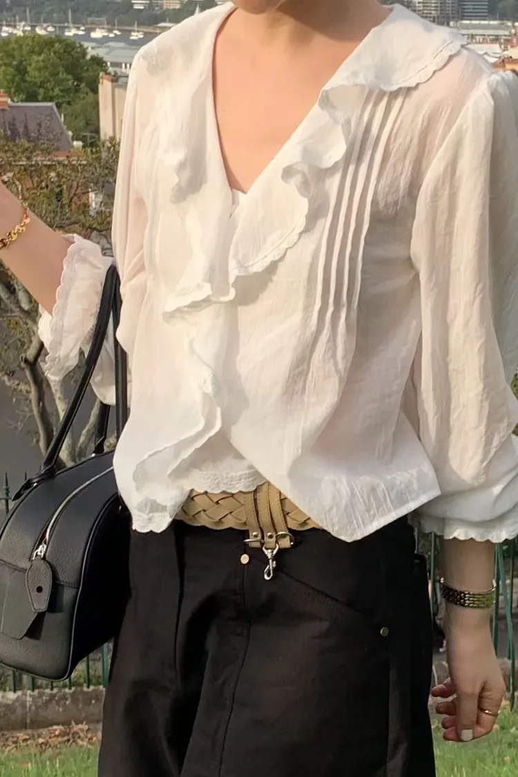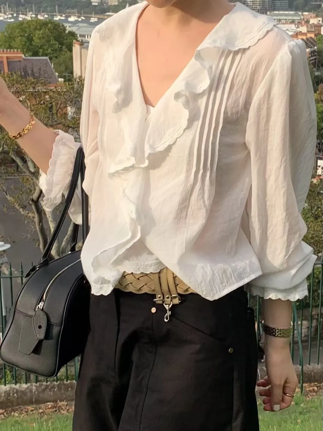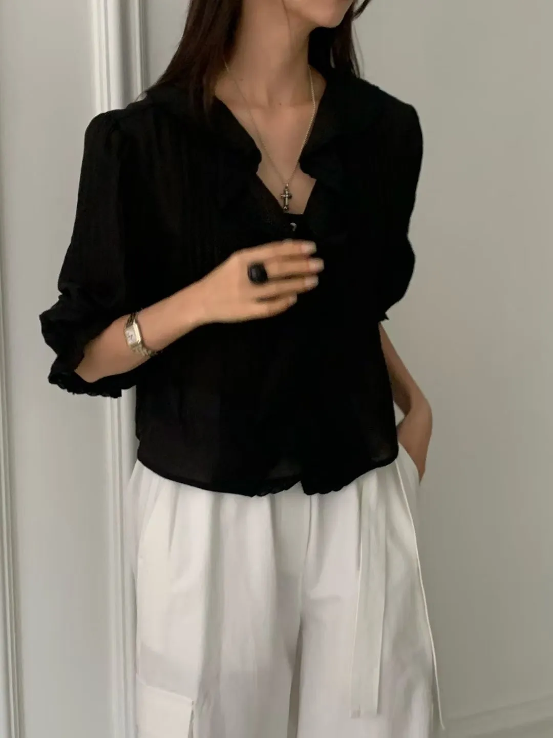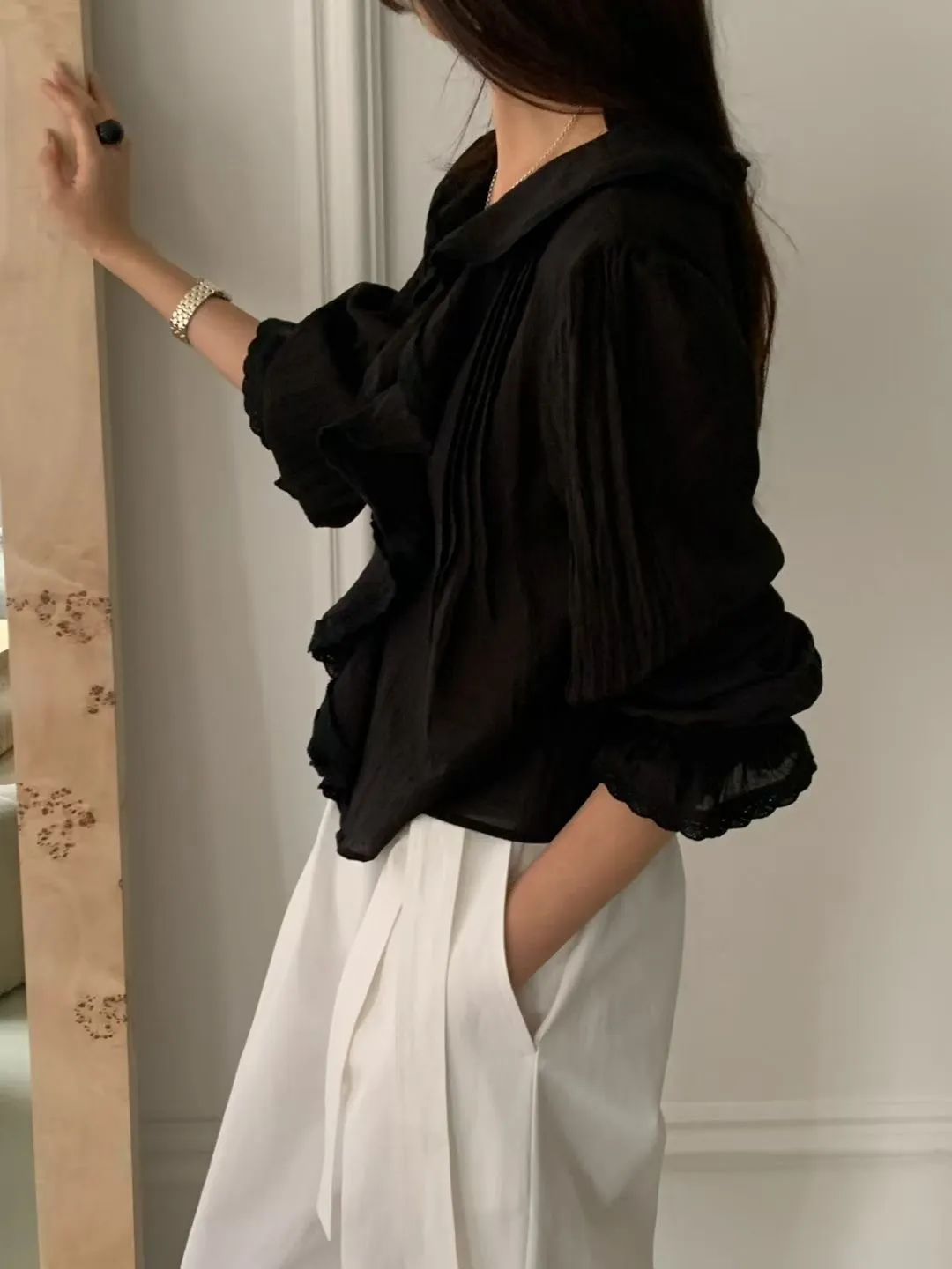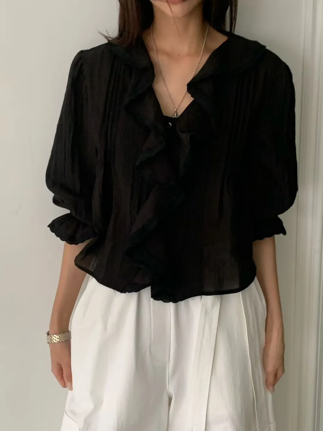 A19甜甜的好氣質滾邊蕾絲領罩衫上衣