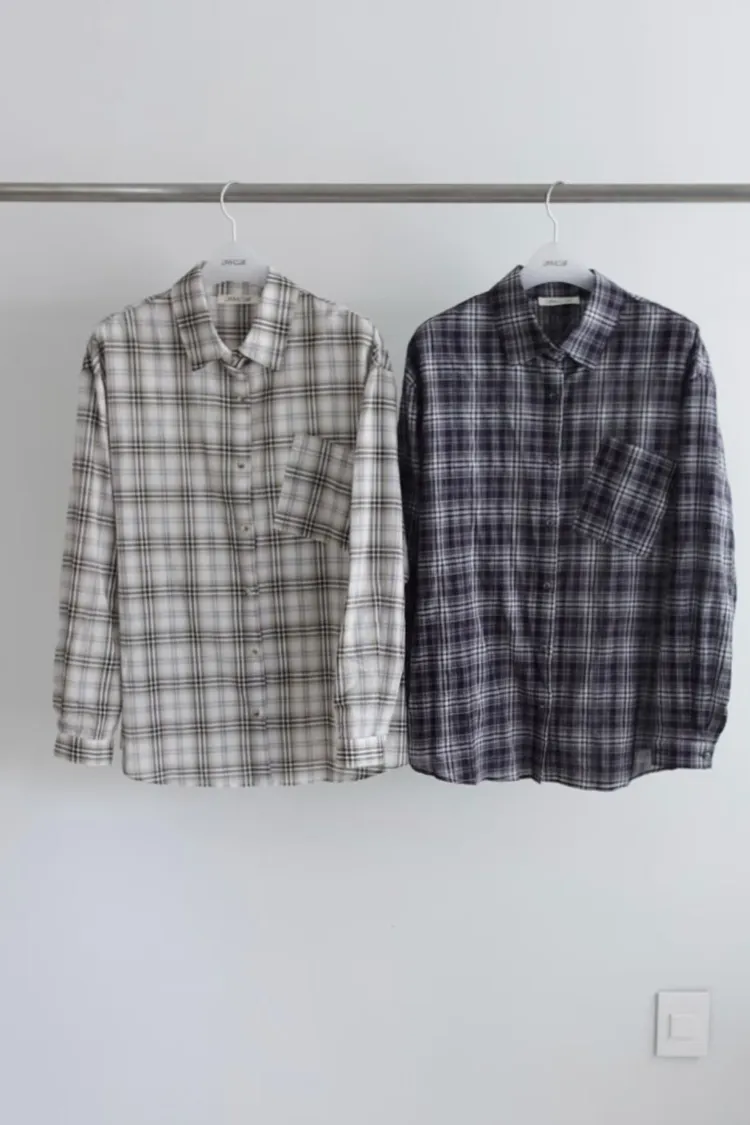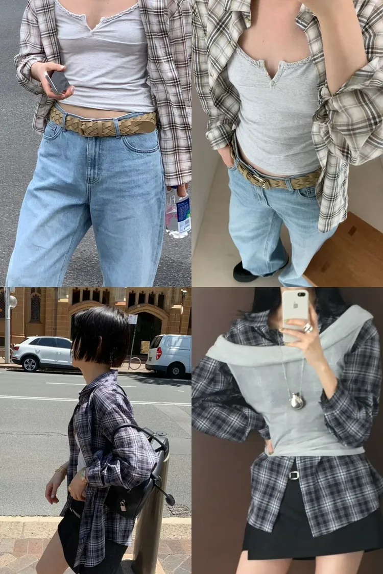 A21時髦有個性的拼接口袋長袖格子襯衫