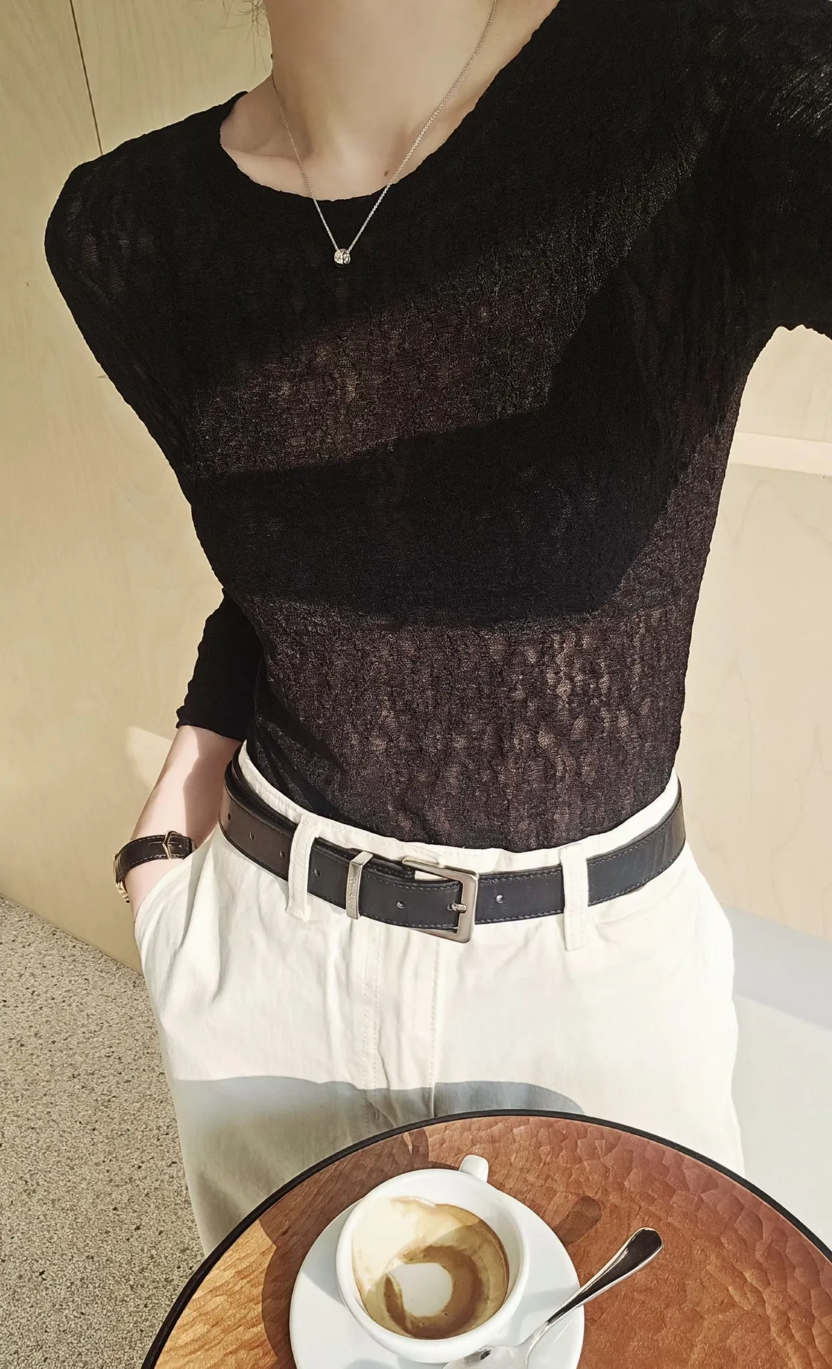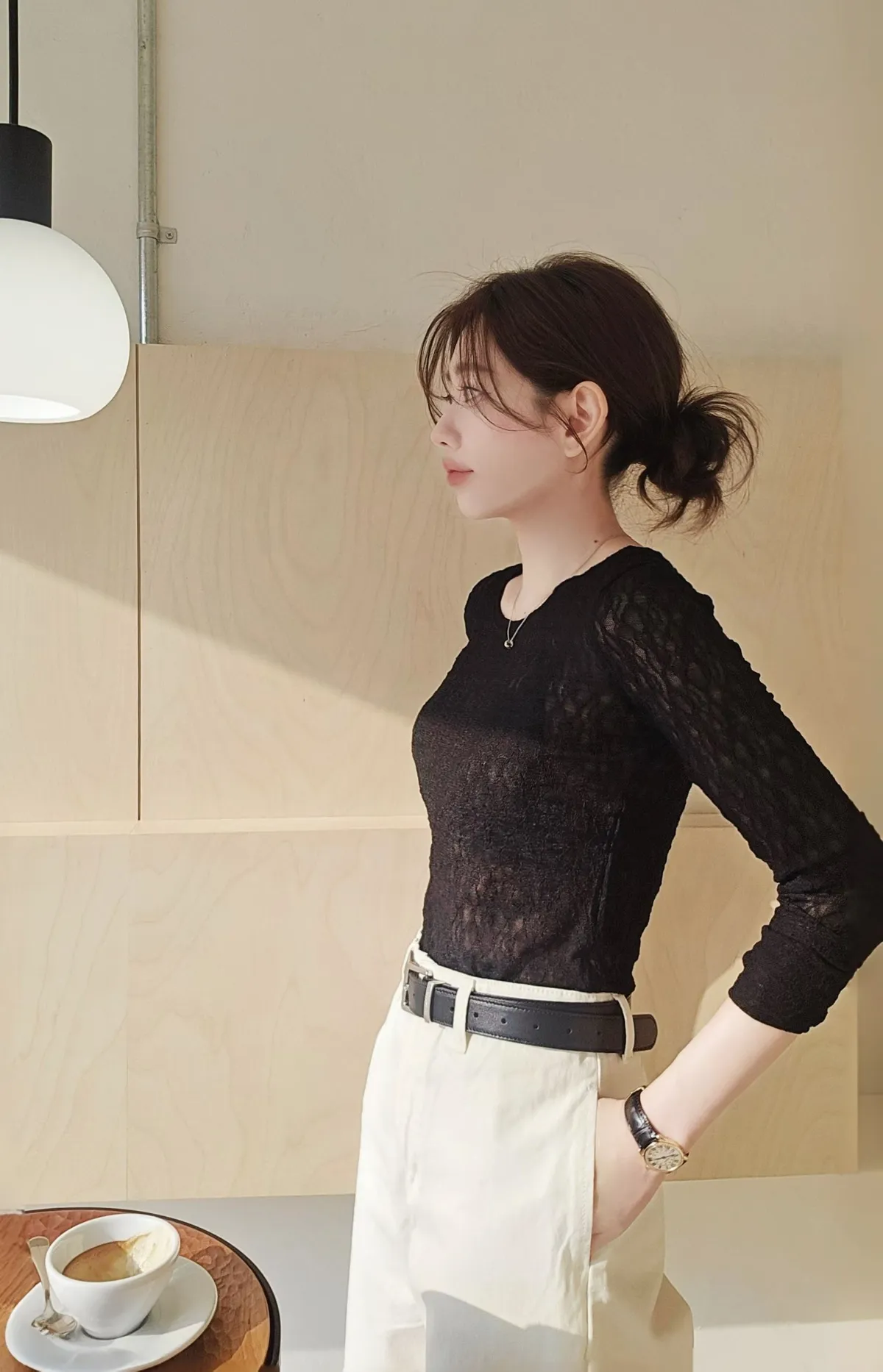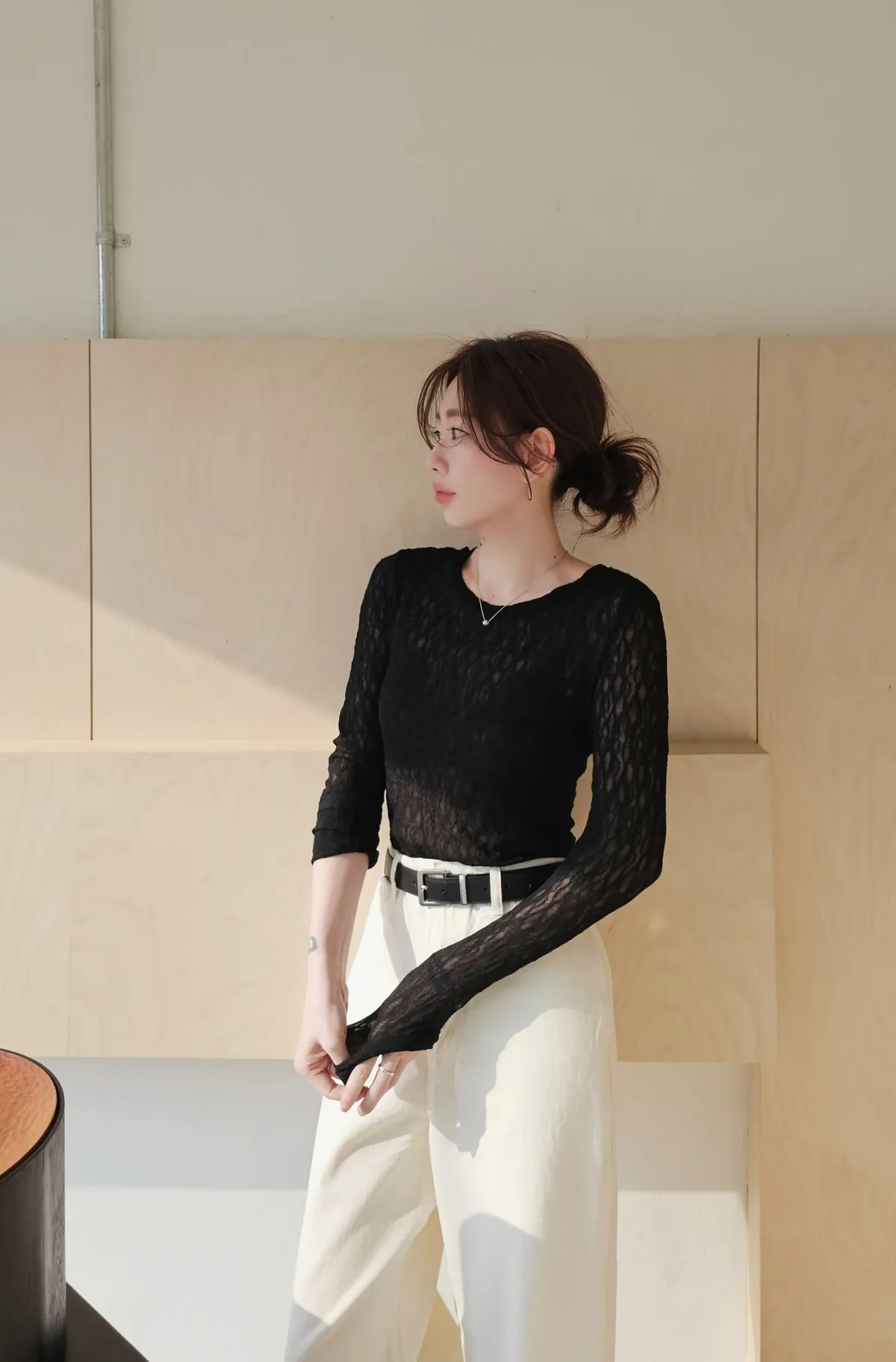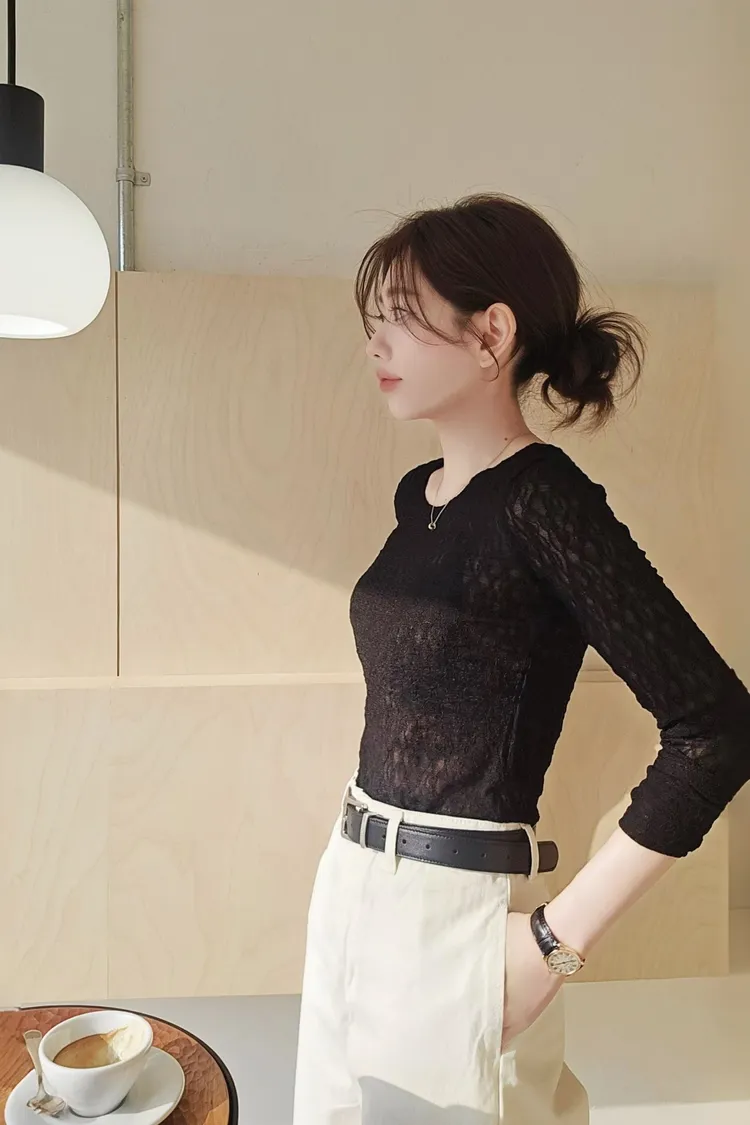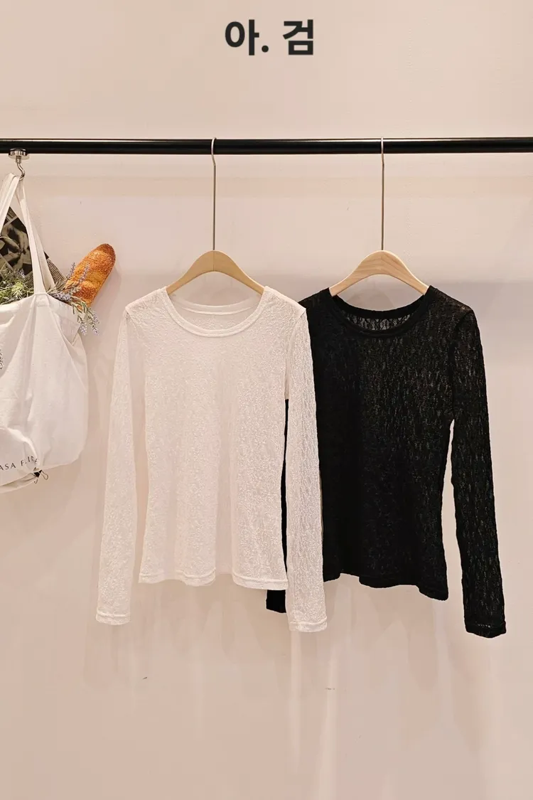A45春天高級彈力蕾絲打底長T